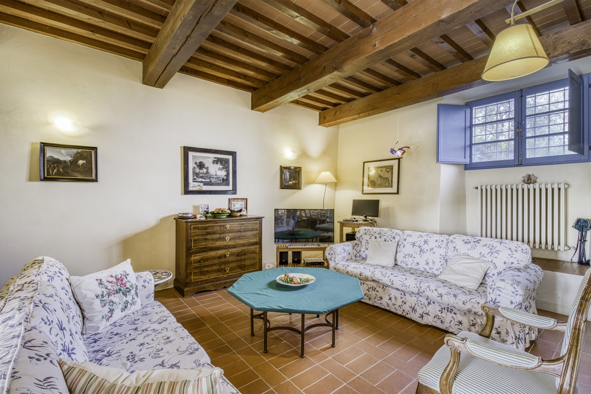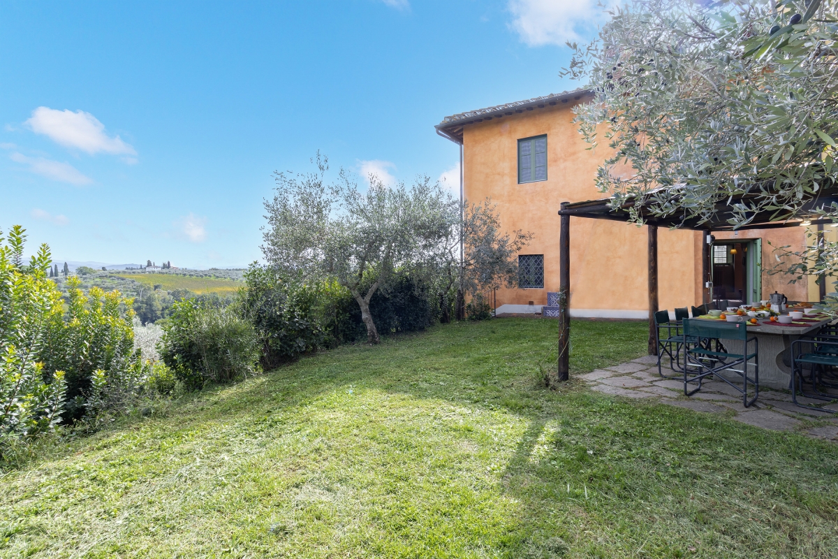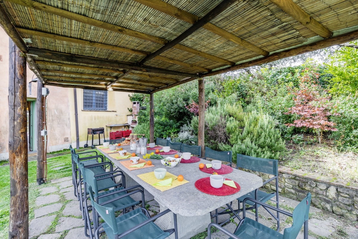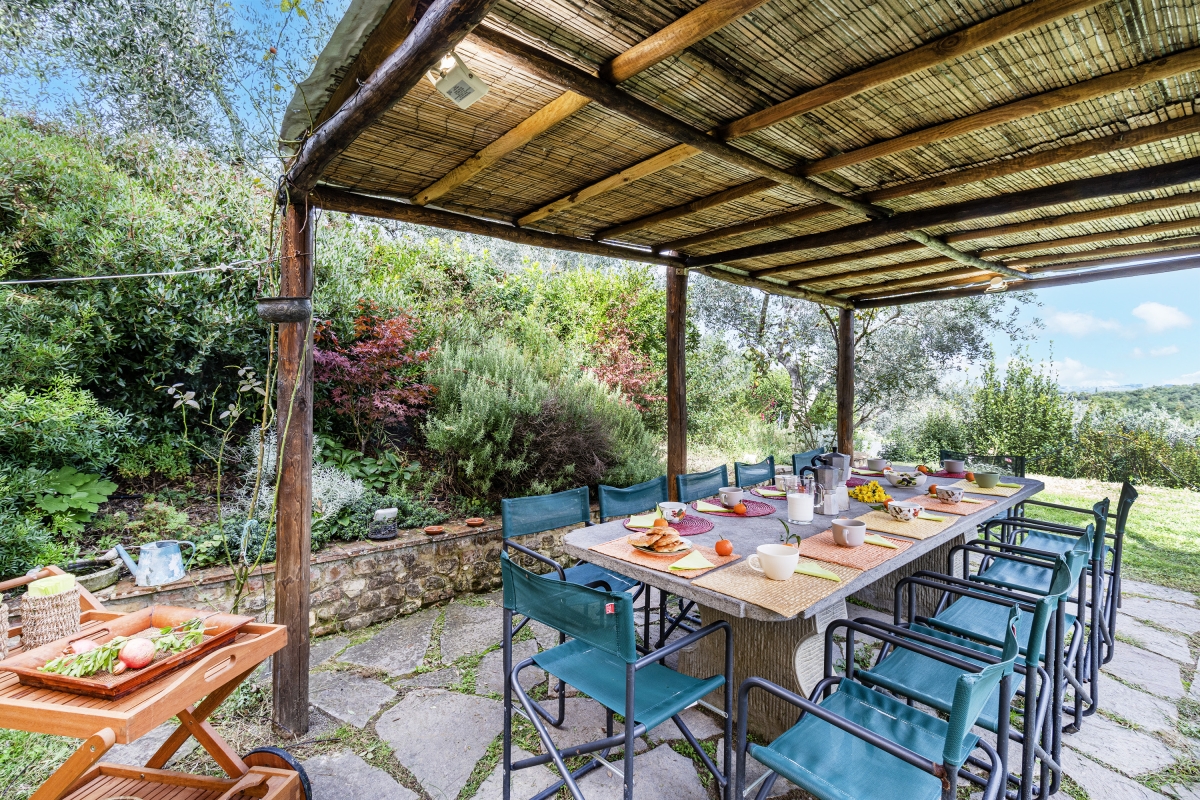 French windows lead from the sitting room into the garden. Outside, immerse yourself in the beauty of the Tuscan landscape. The property features private and shared gardens. The shaded private outdoor dining area includes use of a shared barbecue, perfect for alfresco meals surrounded by greenery.