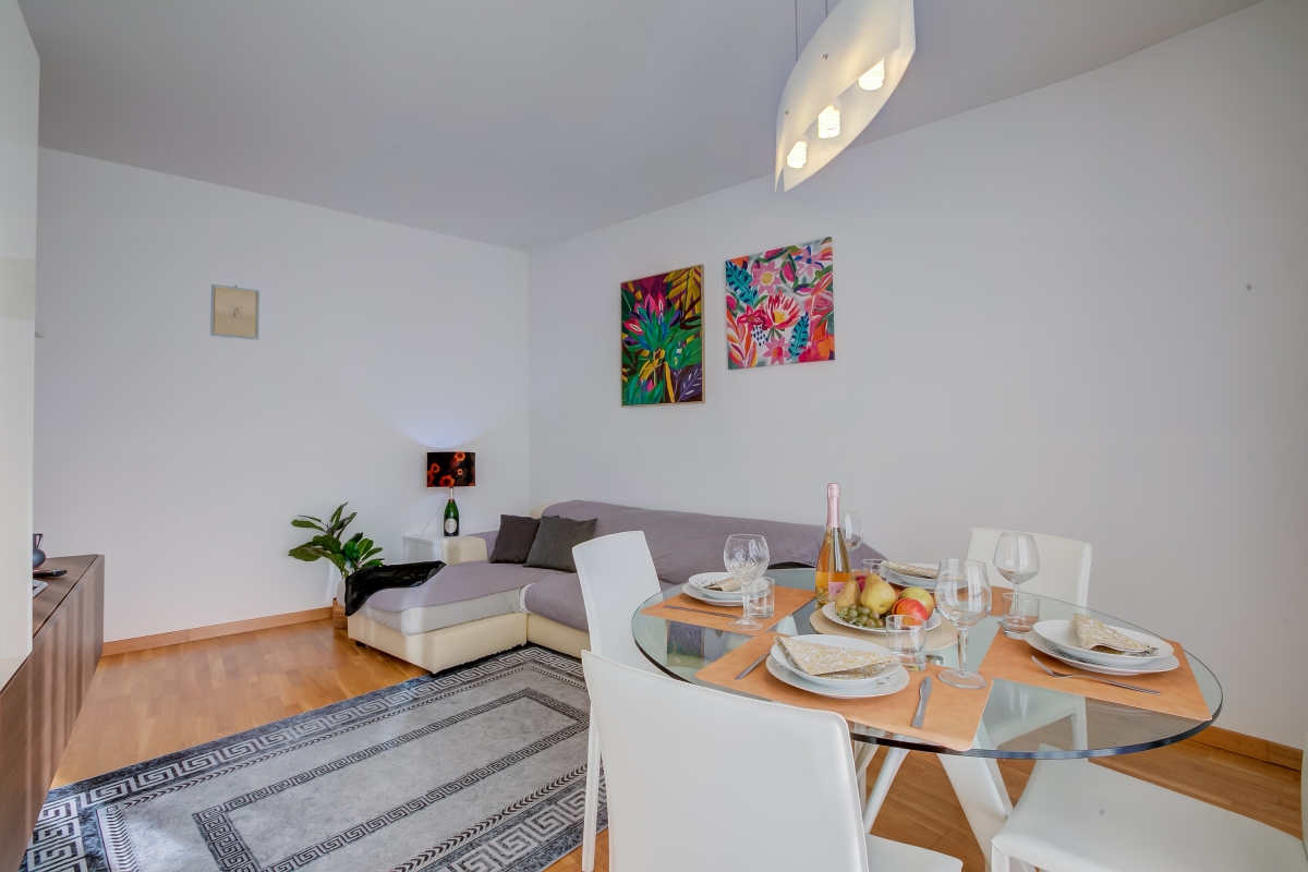 Inside, guests can relax in the bright and airy living space that looks out to a sunny balcony and is furnished with a large L-shaped sofa, a dining table and a Smart flatscreen TV. The separate kitchen is furnished with a breakfast table and well equipped with a Moka coffee machine, a cooker hob, an oven, a microwave, a dishwasher and a fridge freezer.