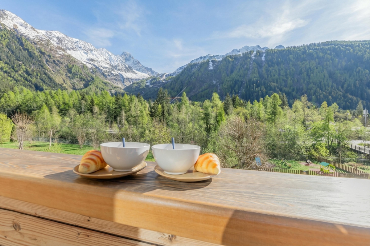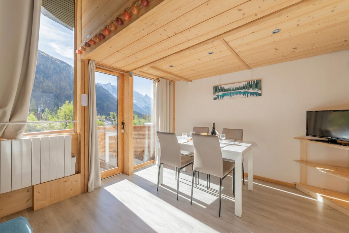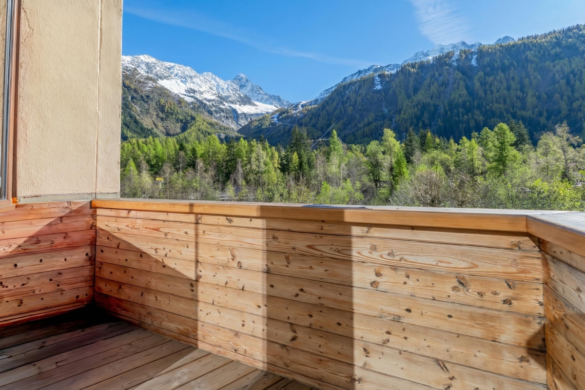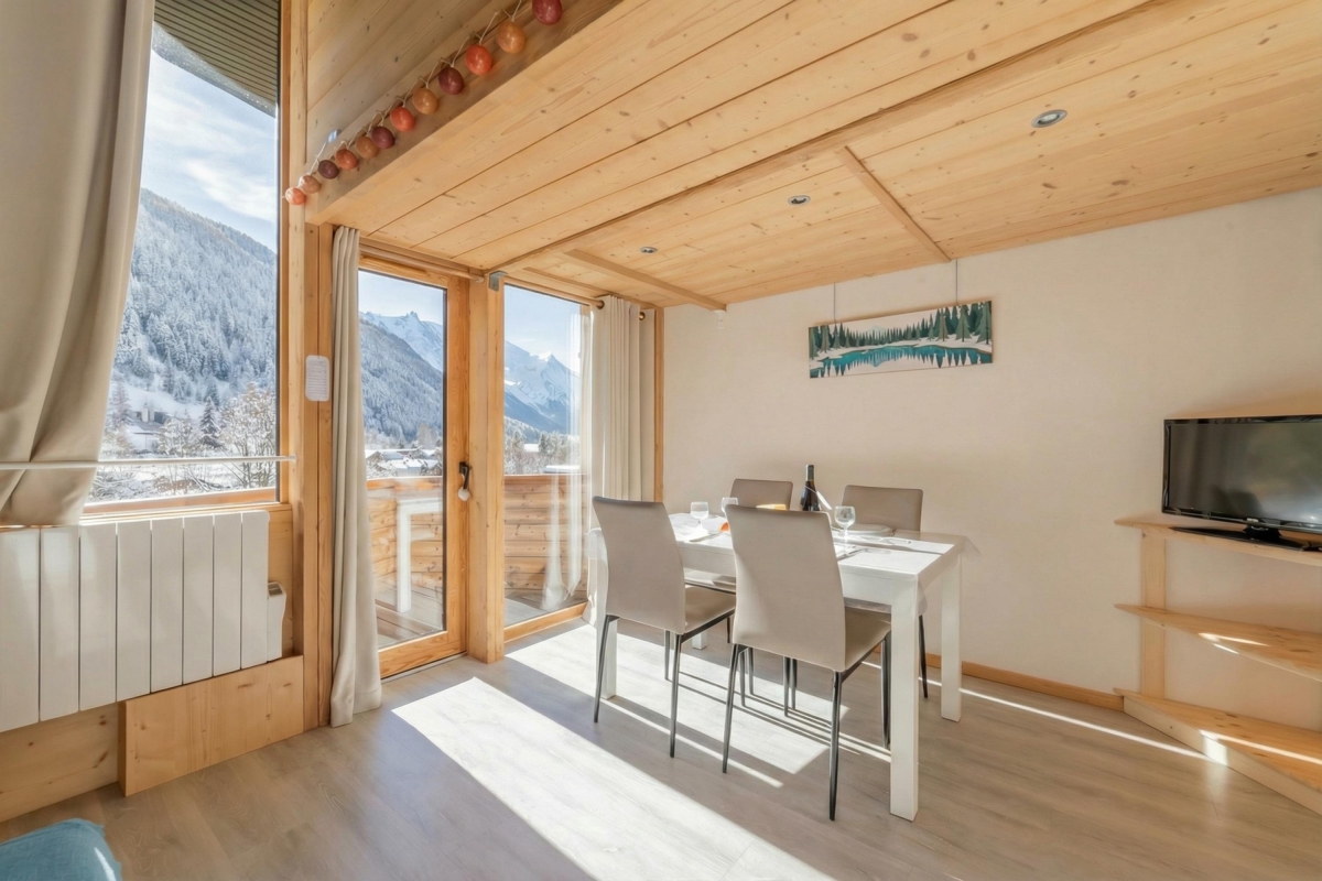 Experience panoramic mountain views of Grands Montets, Aiguille Verte, Aiguille du Midi, and Mont Blanc from this duplex apartment in Argentière!