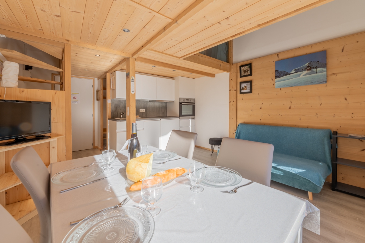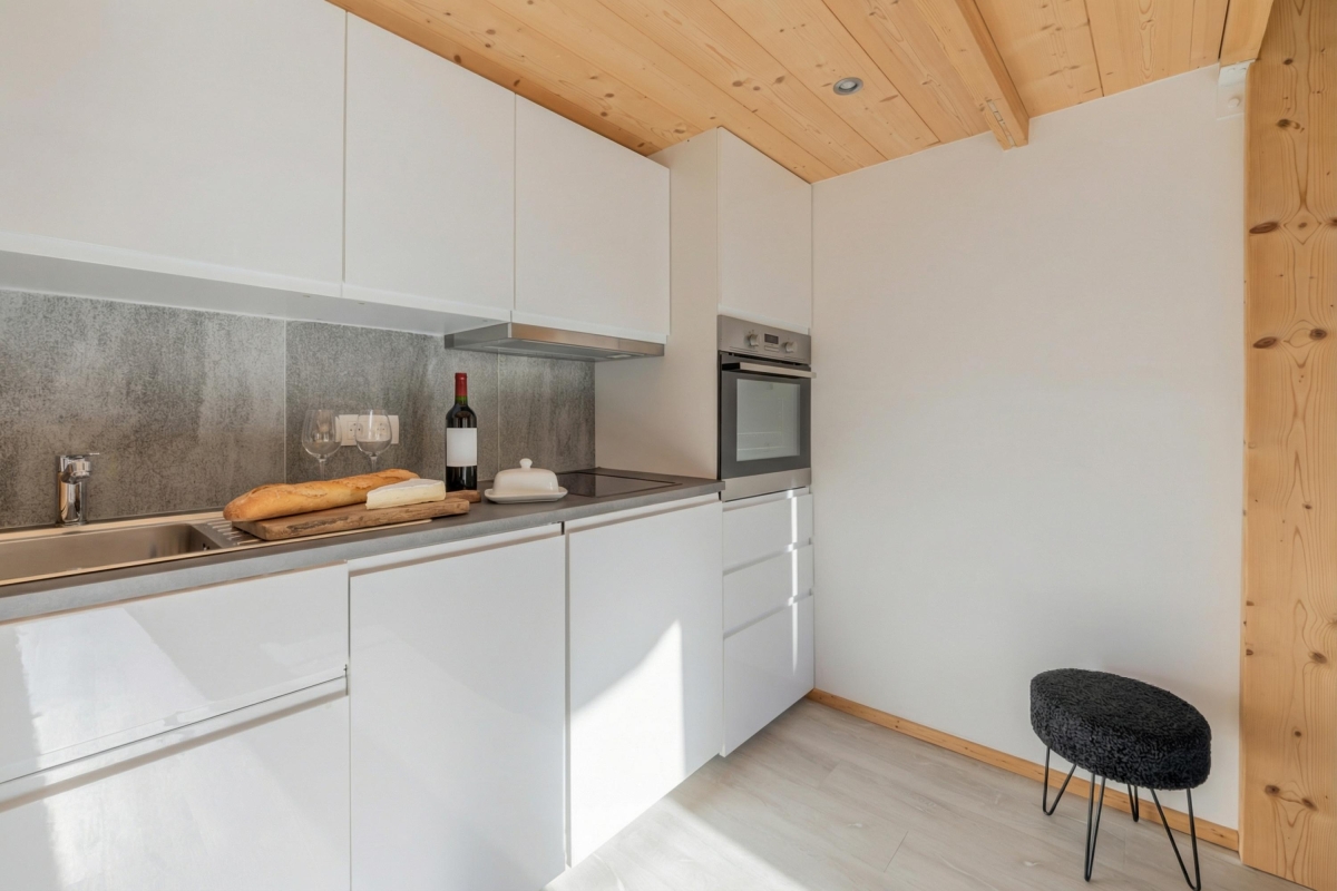 The open-plan living area is full of light, thanks to the large windows and glass door, which leads onto the balcony. It is furnished with a sofa and a flat-screen TV. The dining table is next to the seating area, and a new, fitted kitchen is at the other end of the room. The kitchen is equipped with a cooker hob, oven, microwave, dishwasher, fridge and a Nespresso coffee machine for easy catering. There is a washing machine and a dishwasher in kitchen.