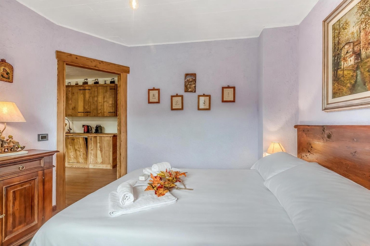 Bedroom: The master bedroom has a king-size double bed and extensive wooden wardrobes. A glass door opens onto a small balcony.