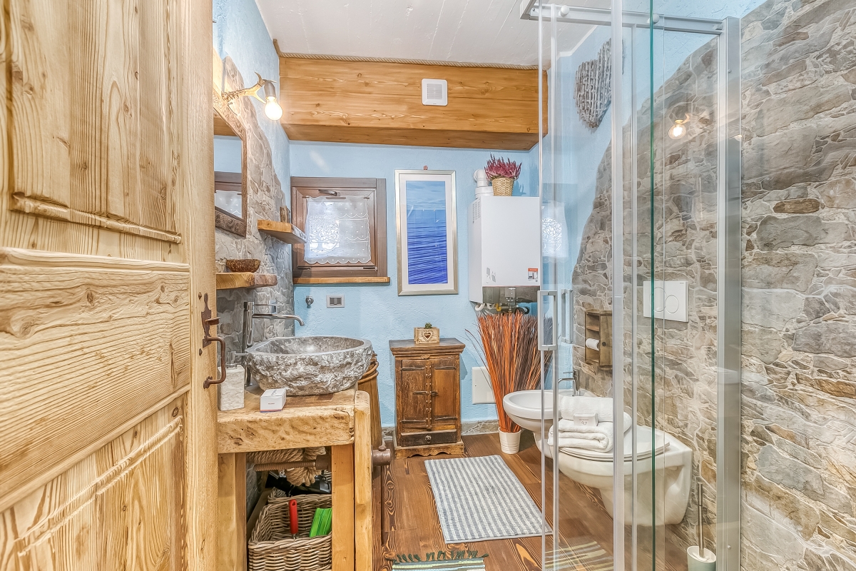 The beautiful stone bathroom has a glass shower, a stone basin, bidet and WC