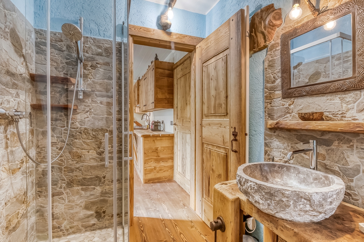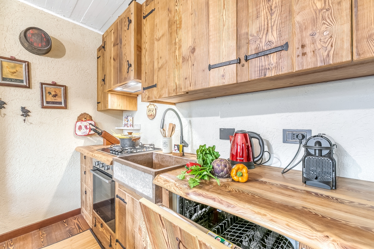 The lodge is built on the mountainside, so whilst the front door is on the ground floor, the balcony at the back, overlooks a lush valley and the Alps beyond. There is a café-style table and chairs on the balcony so that guests can enjoy the stunning views with a cup of coffee or glass of wine. The open plan living/dining area is comfortably furnished with a sofa, a fireplace and a flat-screen TV next to the dining table, which seats up to 4 people. The stylish open kitchen adjoins the dining area. It is equipped with a cooker hob, oven, dishwasher, Nespresso coffee machine and fridge/freezer.