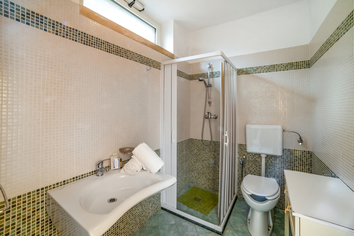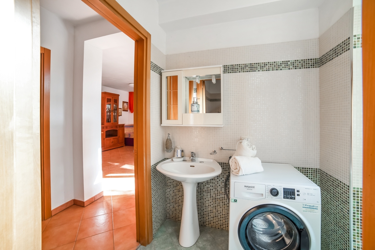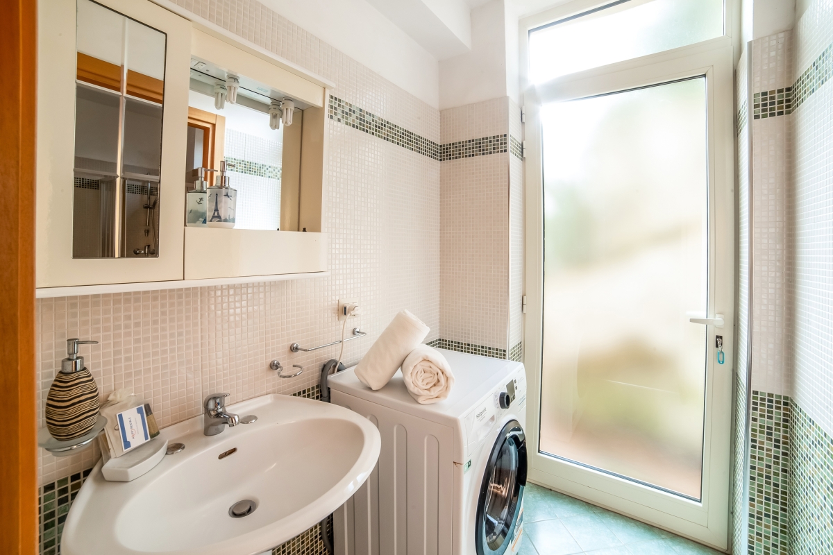 The mosaic bathroom is appointed with a shower, basin, WC and washing machine.