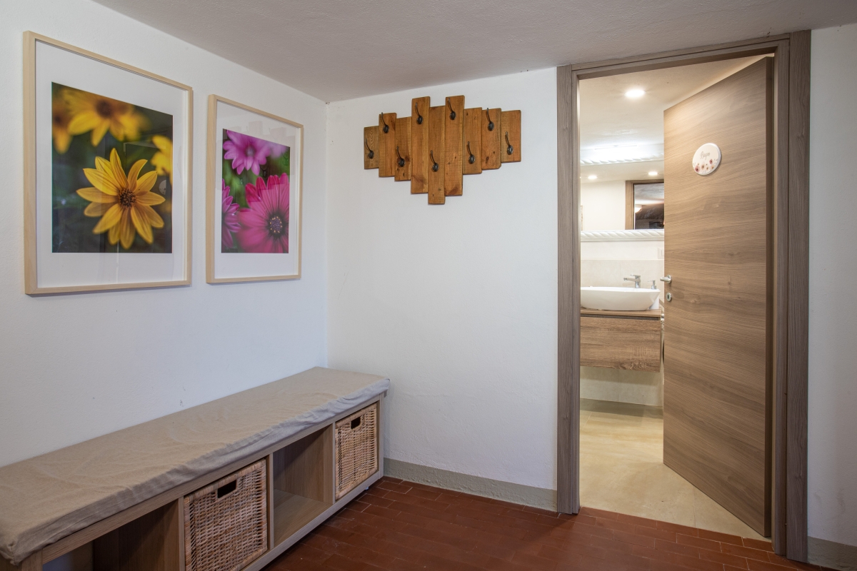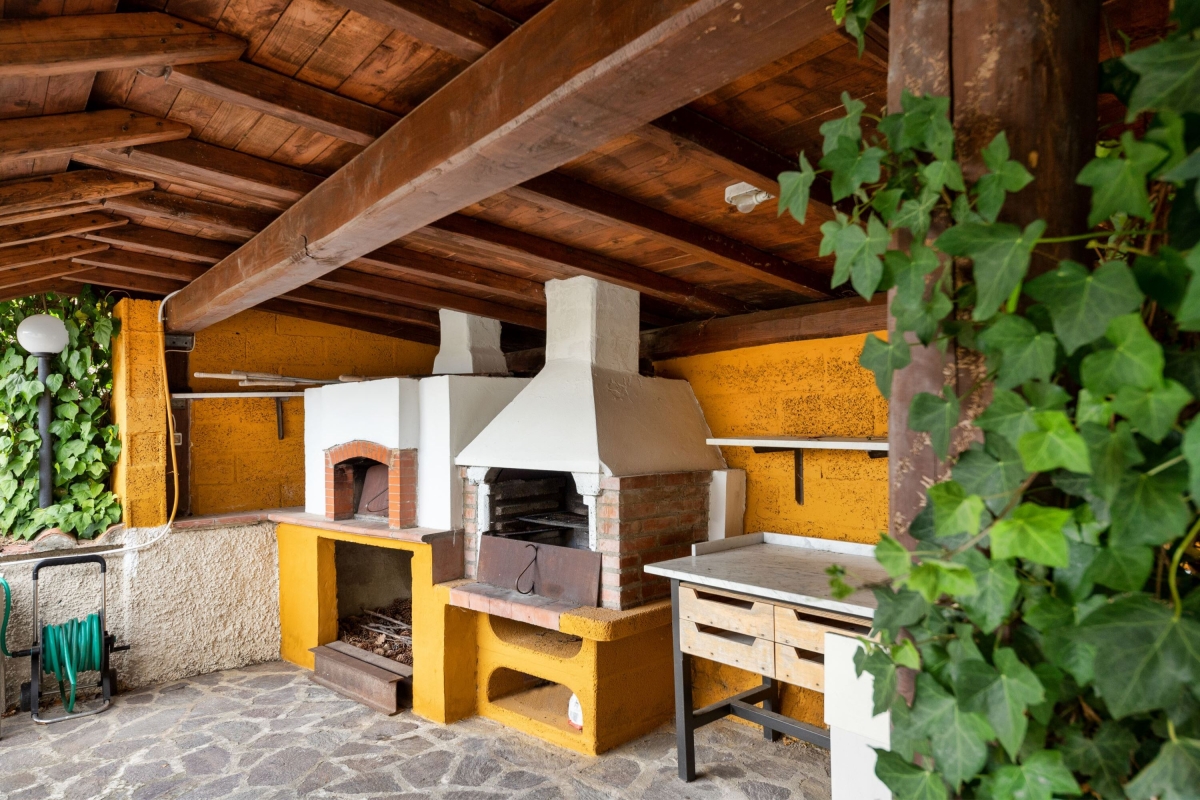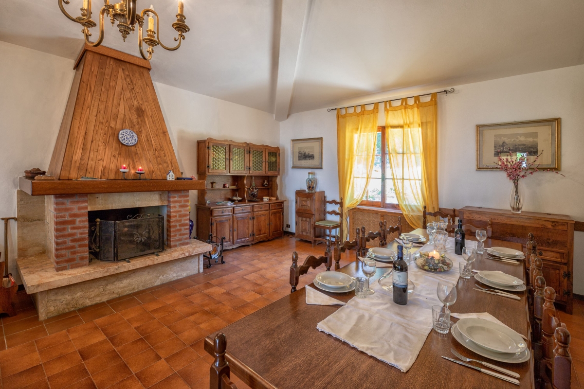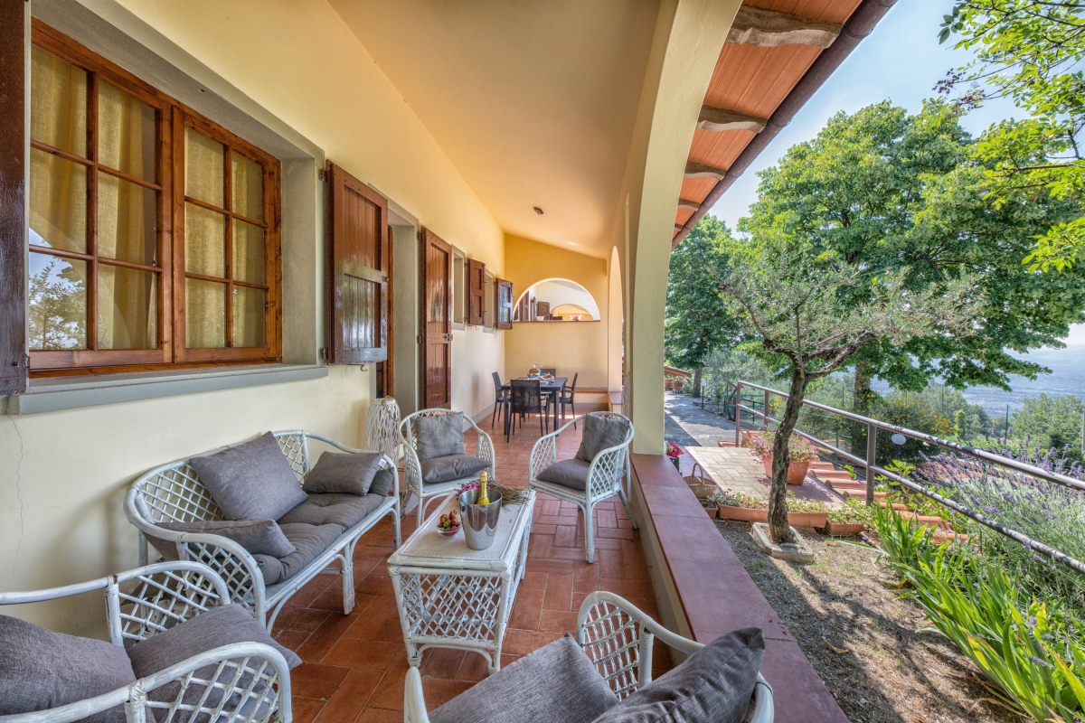 The villa is divided into two separate flats which enjoy magnificent views over the valley. The apartment is on the first floor and has a private, shaded balcony furnished with a sofa, armchairs and a dining area. Inside, there is an open-plan living room with high ceilings and a traditional fireplace. It is furnished with a sofa, armchairs, flat-screen Smart TV and a dining area. The separate kitchen is equipped with a cooker hob, oven, dishwasher, microwave, fridge-freezer and Moka coffee maker.