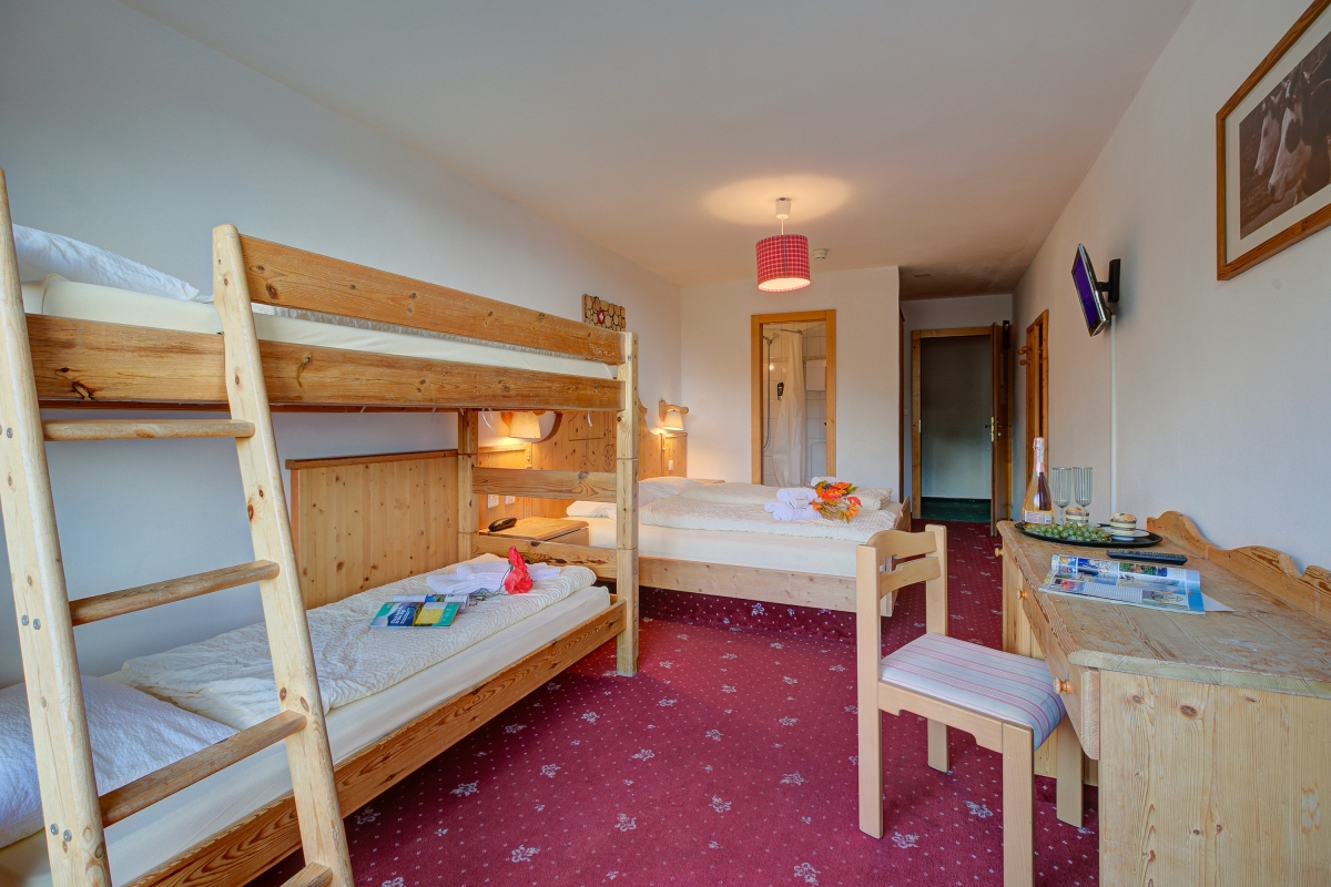 This room features a bunk bed, 2 single beds, a wardrobe, a bathroom and opens onto a balcony. Equipped with free Wi-Fi, the room offers a comfortable space to unwind after a day in the mountains.