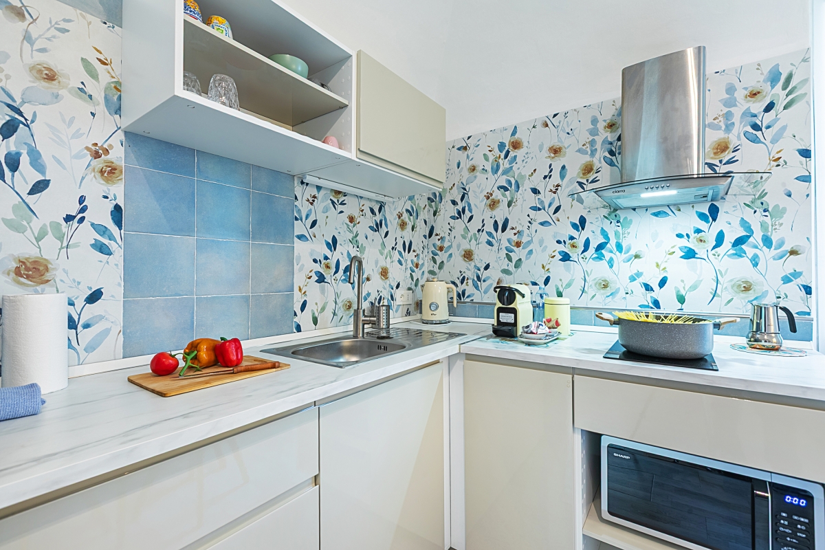 The front door opens into an open-plan living area. This is furnished with a contemporary sofa, a flat-screen TV and a dining table. The fitted kitchen is equipped with an induction hob, microwave, coffee machine and fridge/freezer.