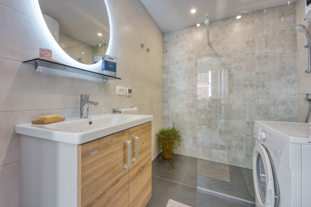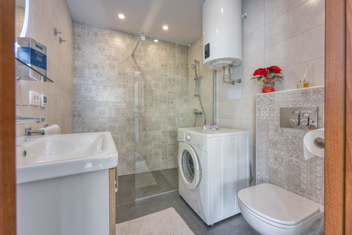 Bathroom 1: The modern bathroom is fitted with a shower, a washbasin and a WC.