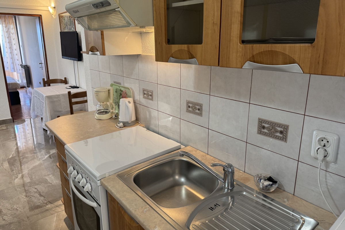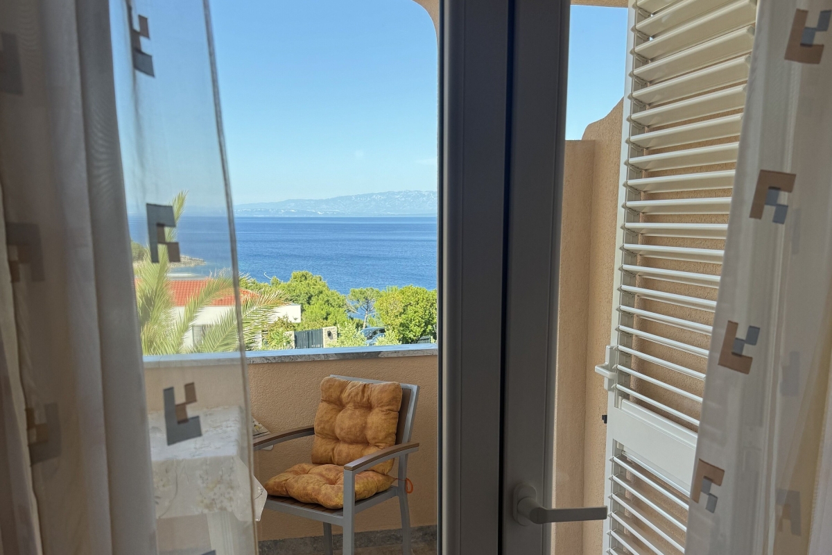 These one bedroom apartment offers everything necessary for a comfortable and worry less holiday. The apartment consist of one bedroom with a double bed and kitchen with living / dining room filled with all cotemporary devices. Rarely good location which combines easy access to the sea, proximity of the town and its markets, private parking place topped by superb sea view from the terrace. All these makes a rare opportunity to pick this accommodation.