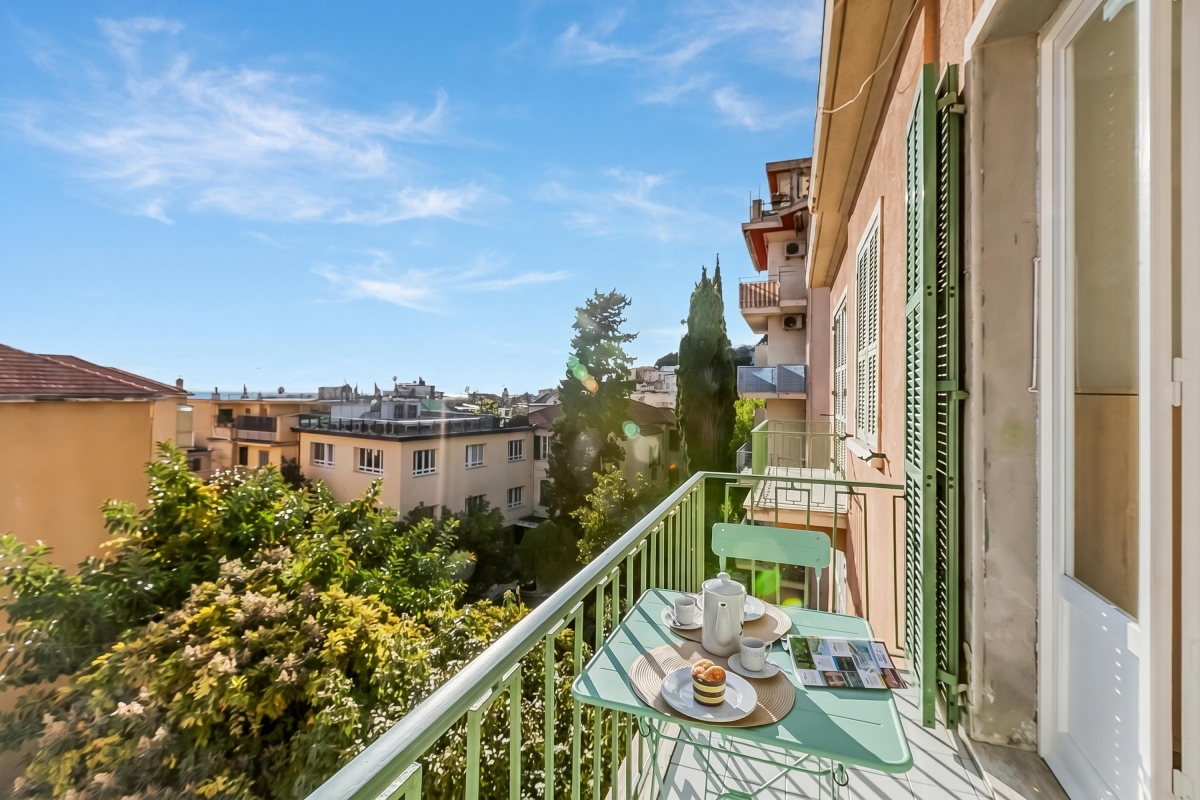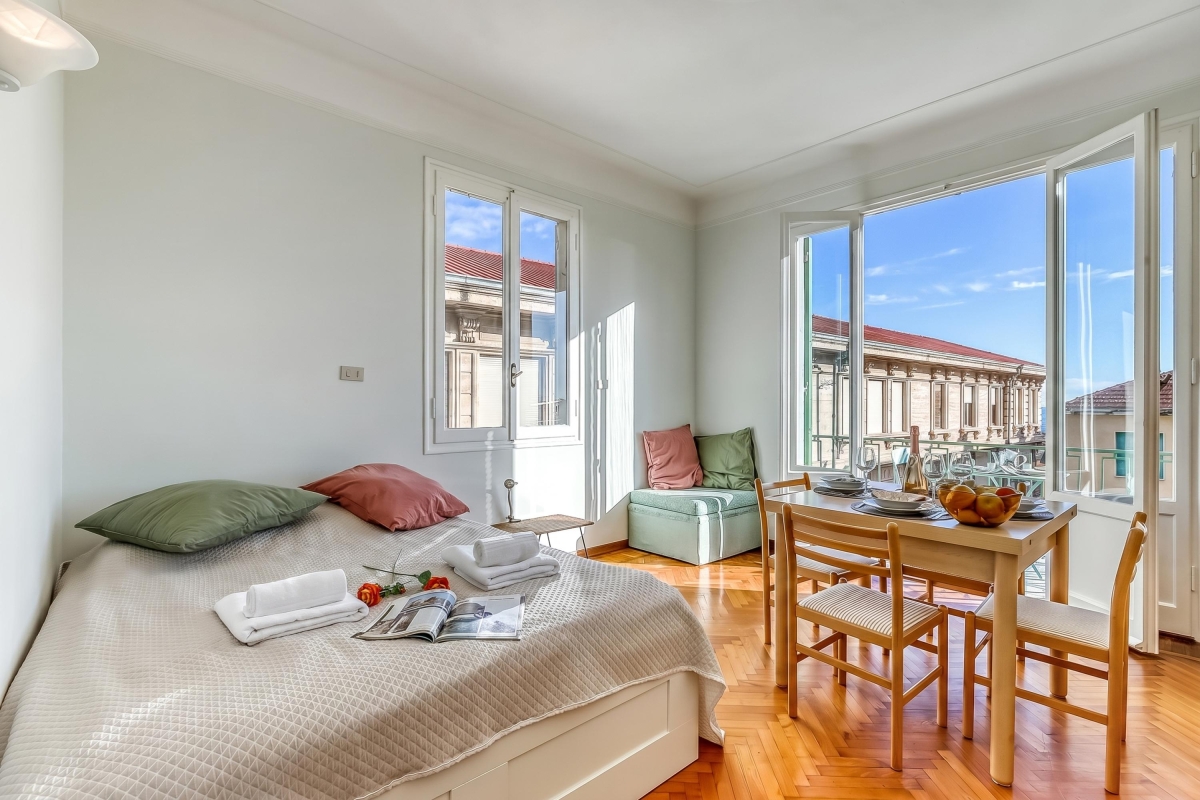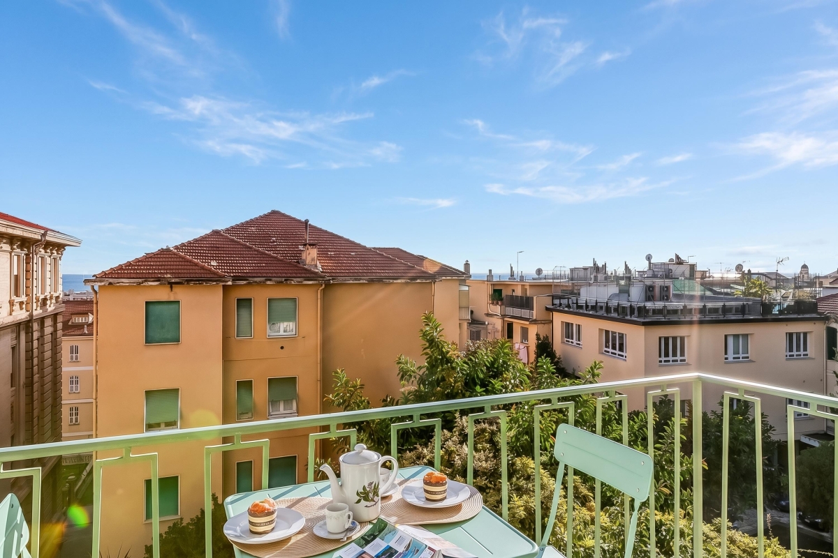 Relax in a bright sea-view apartment with a balcony, quiet surroundings, natural light, and comfortable amenities in charming Sanremo.