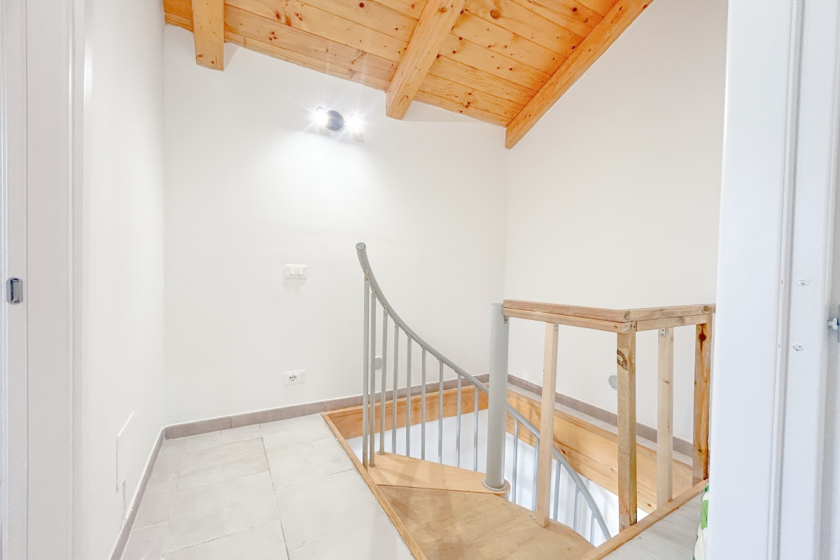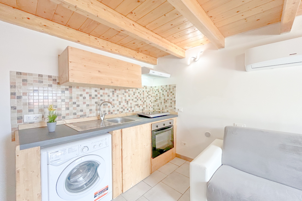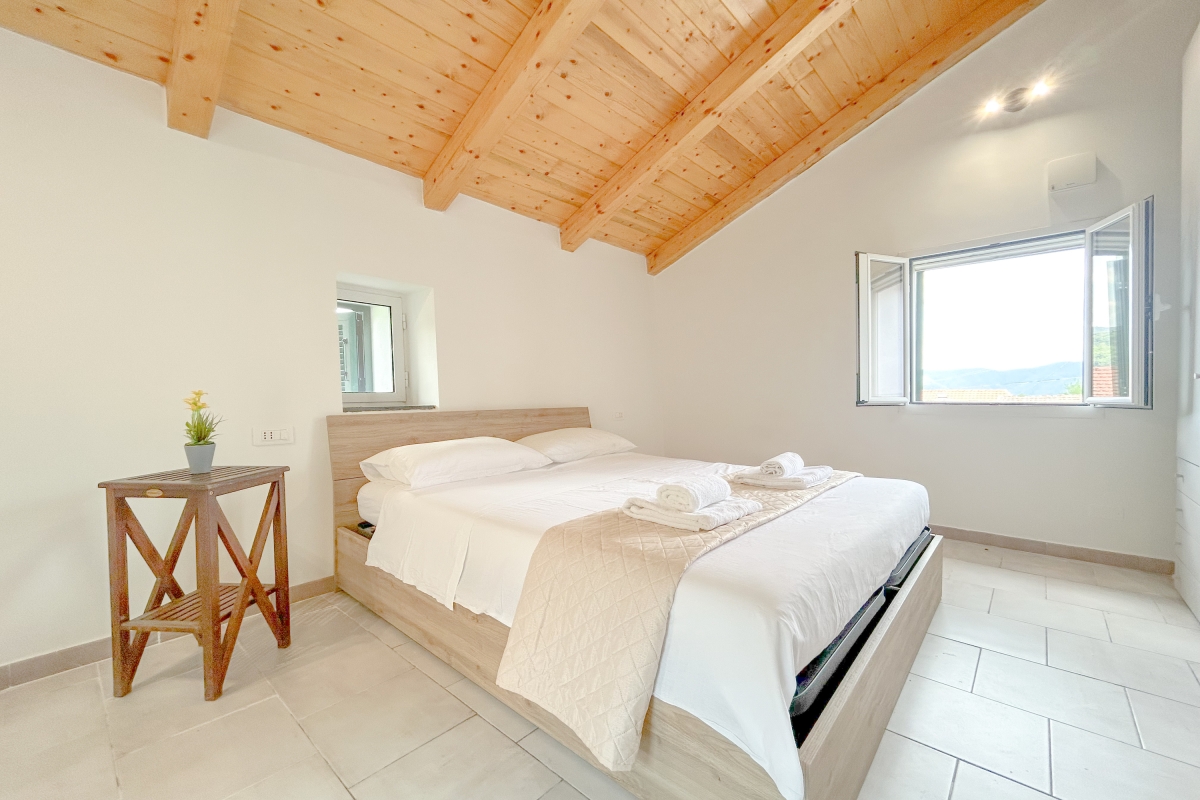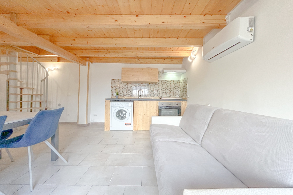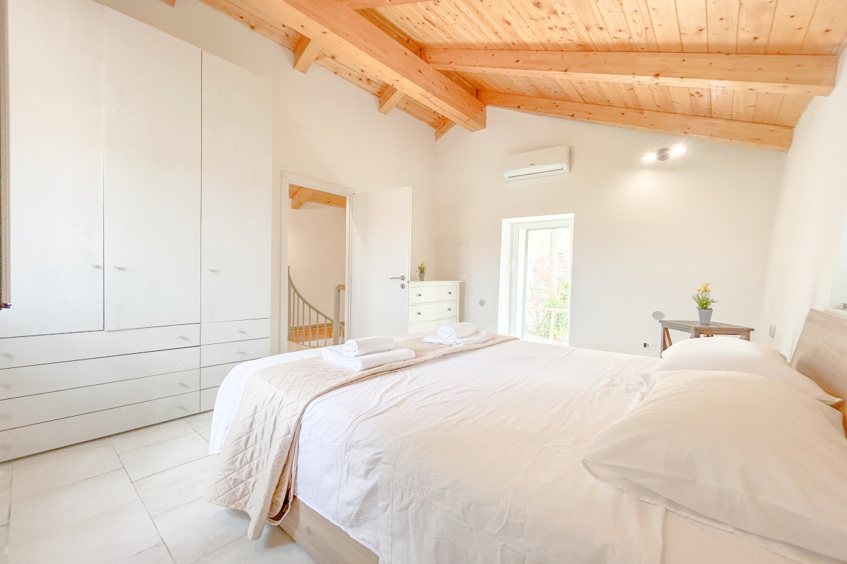 A spiral staircase leads to the upper floor; the house is perfect for a couple or a small group of friends.