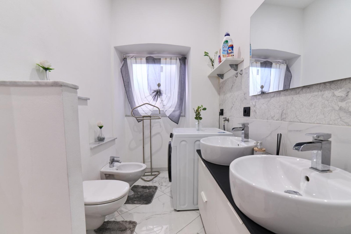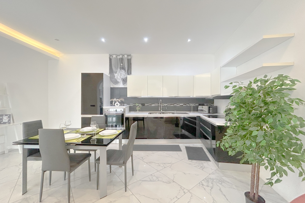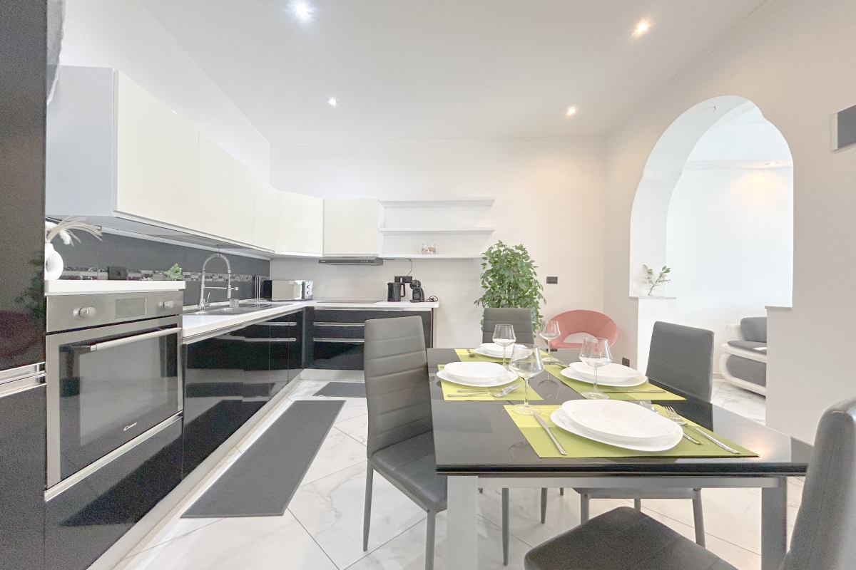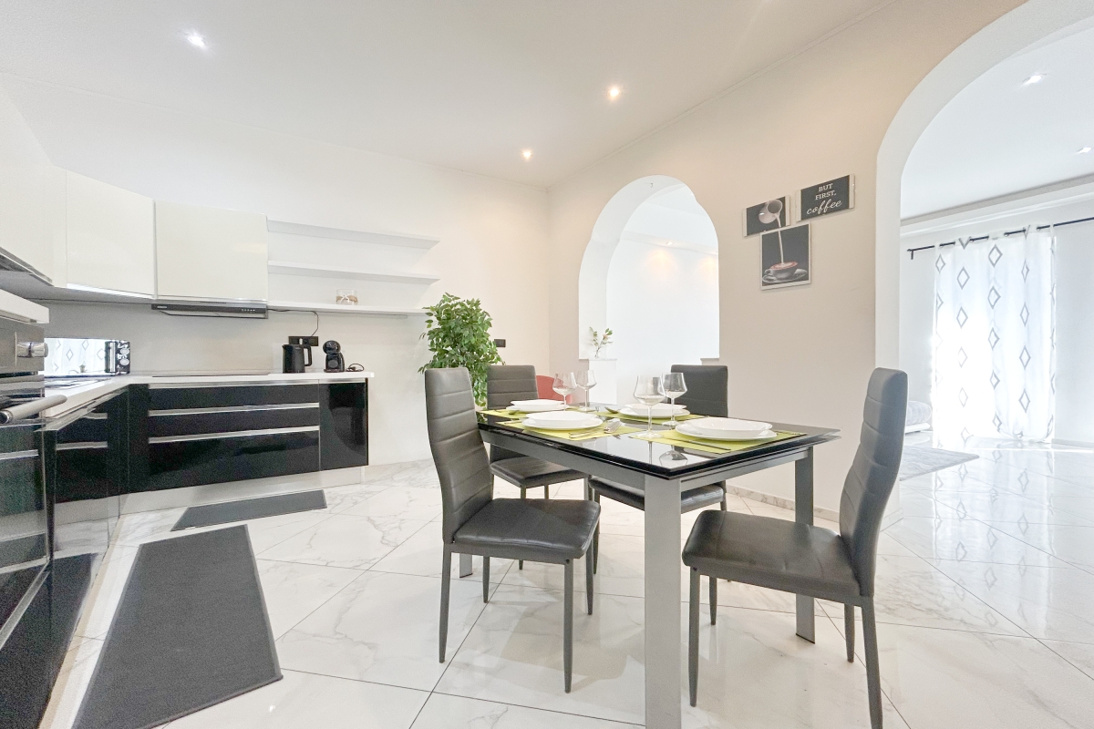 The kitchen is very spacious and fully equipped, with an induction stovetop, dishes, pots and pans, a 100% Italian-made coffee maker, and complimentary capsules.