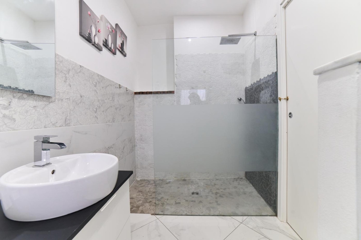 The bathroom features a fantastic walk-in shower, a double sink, and high-quality ceramic fixtures.