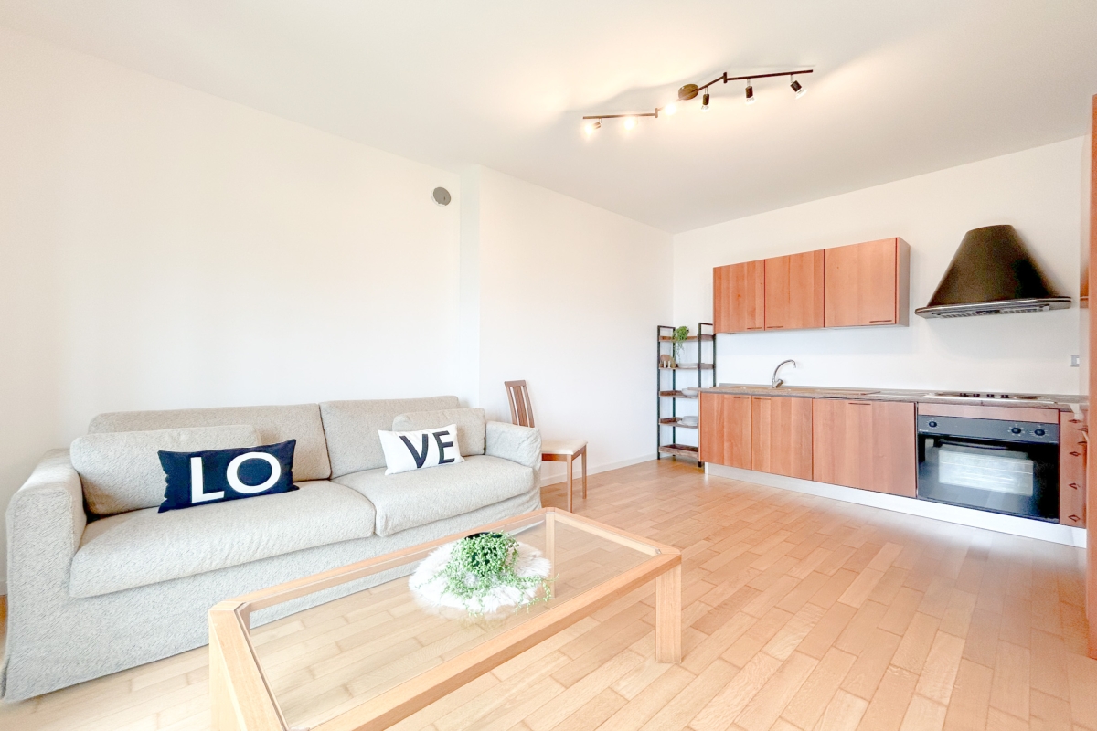 The interior features an open-plan living area with a sofa, a dining space, and large windows. The kitchen is fully equipped with an electric kettle, a coffee machine, an oven, and a fridge.