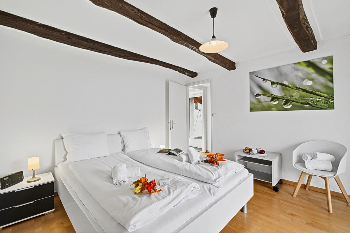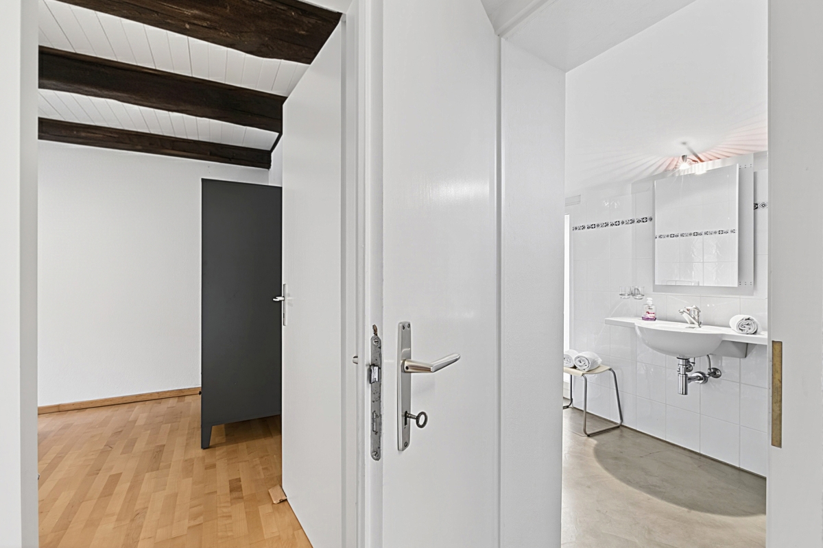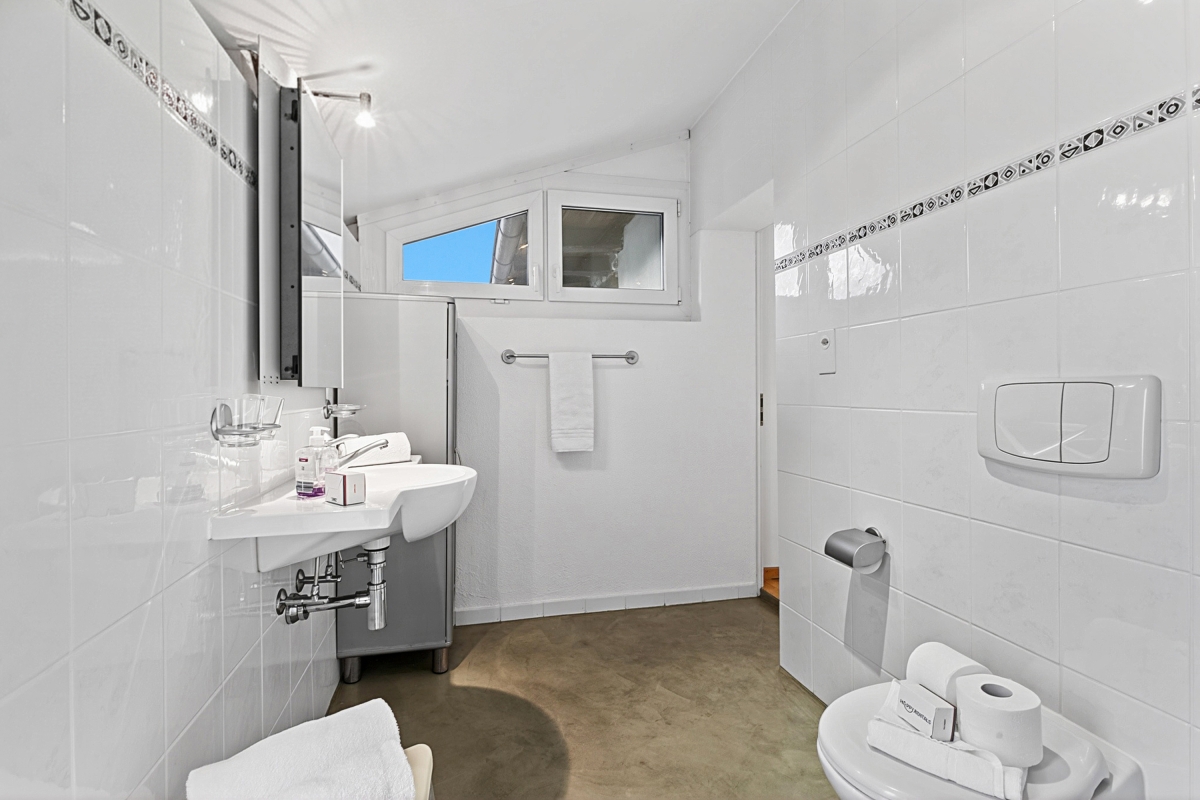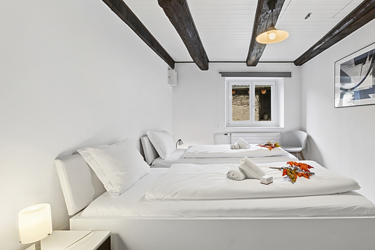 Inside the living room, a staircase leads to the upper floor where you will find two bedrooms, one of which is a double room with a door/window overlooking the lake and a balcony that connects to the large terrace on the upper floor. The second bedroom has a window and two single beds that can also be joined together.