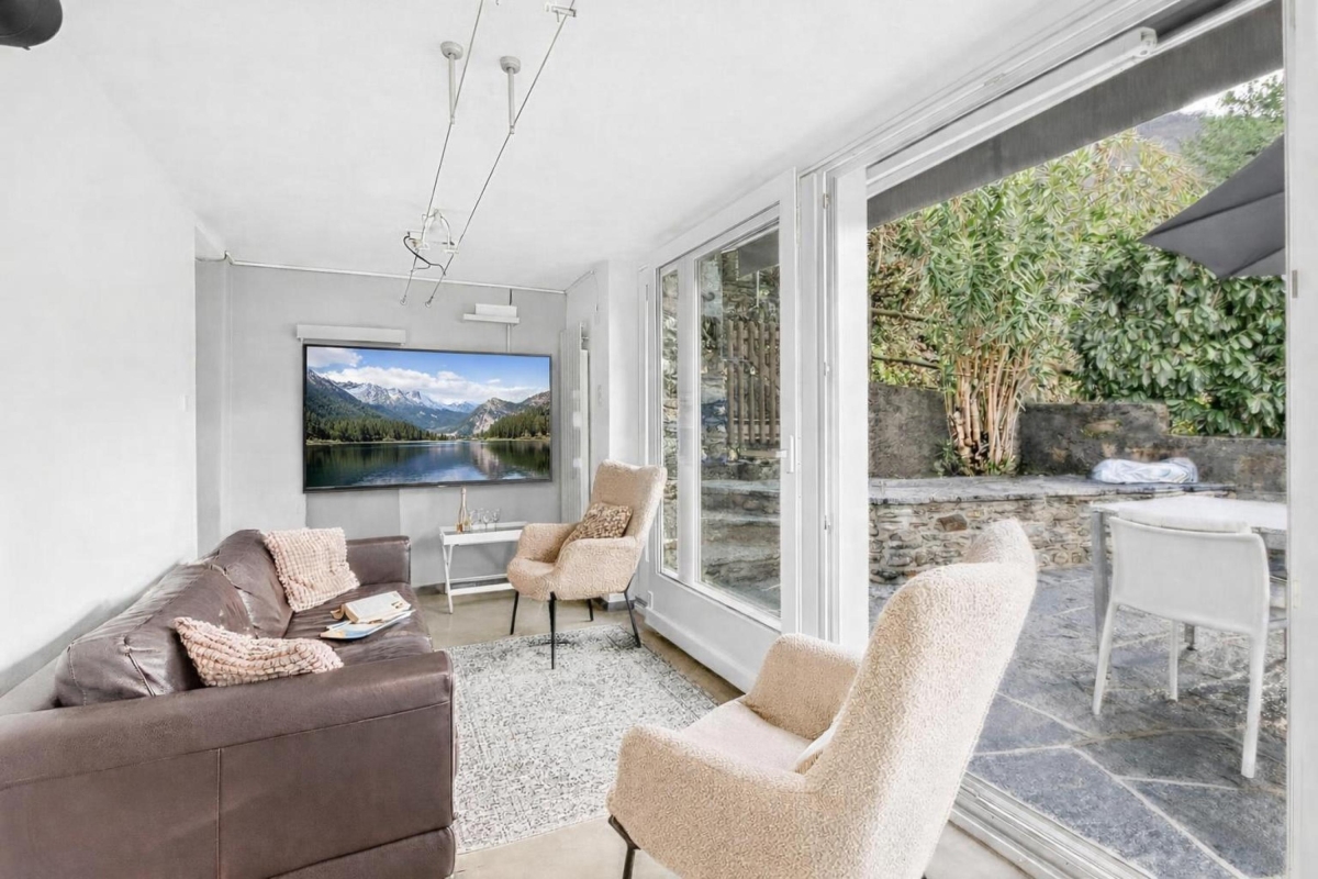 Continuing from the kitchen, there is a large, bright living room with large doors/windows that give access to the large terrace.
