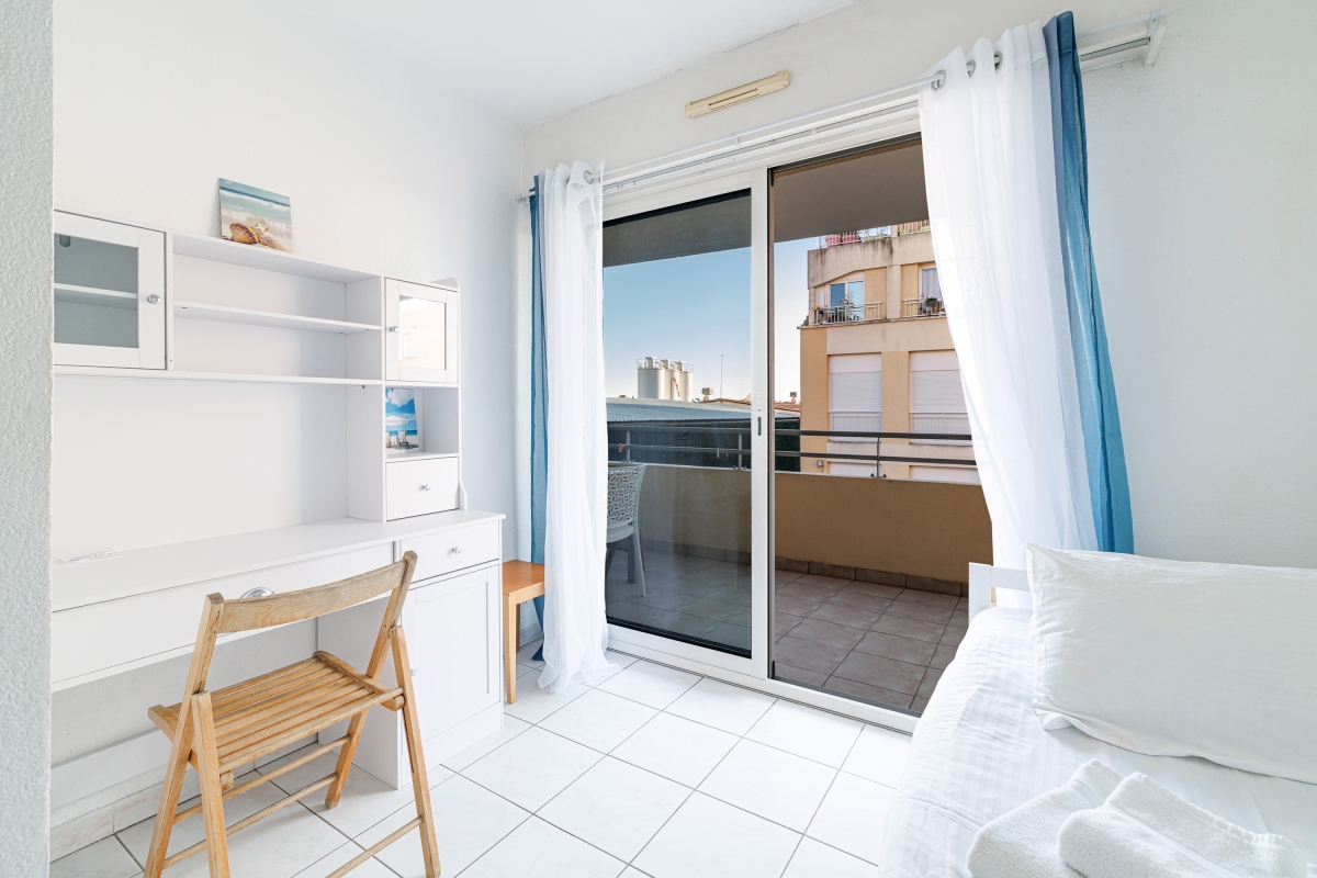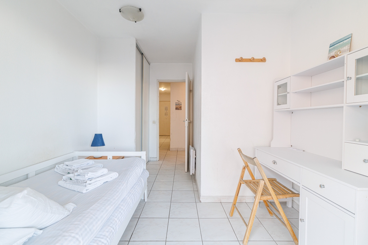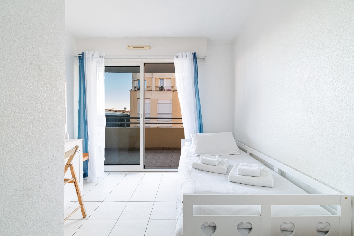 Bedroom 2: The second bedroom is furnished with a single bed, a single pullout bed, a desk and a wardrobe. This room also has direct access to the balcony.