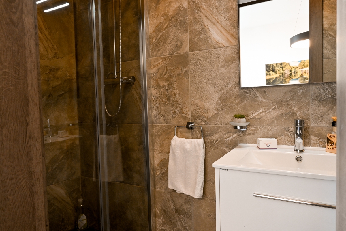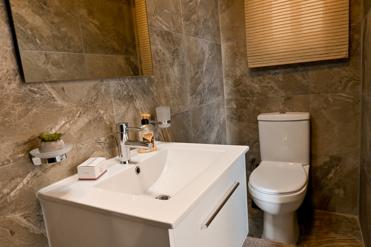 Bathroom 1: This bathroom features a shower, wash basin, and WC.