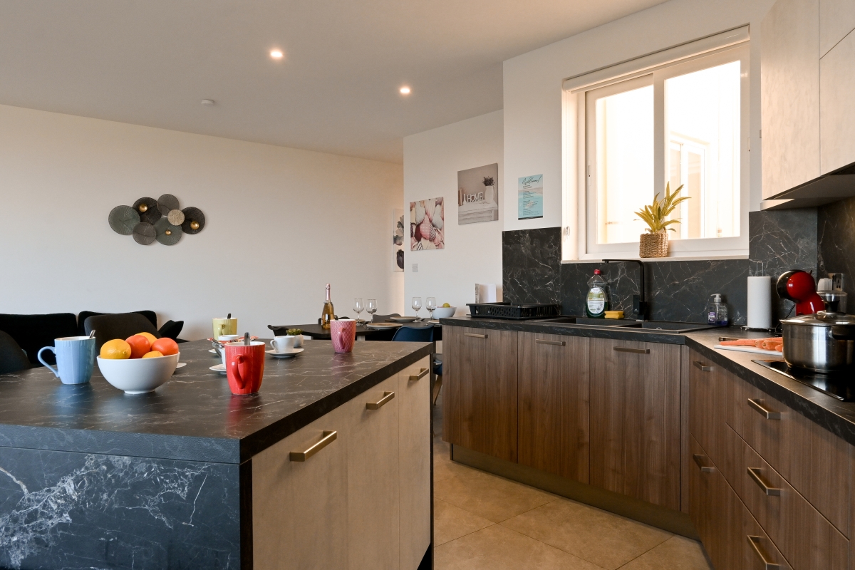 The apartment features two spacious bedrooms and two contemporary bathrooms, finished to a high standard with a sleek, modern feel. The bright open-plan living area is filled with natural light and opens onto a large private balcony offering beautiful sea views. Here, you can enjoy outdoor dining at the table and chairs, fire up the barbecue, or simply relax while soaking in the peaceful surroundings.