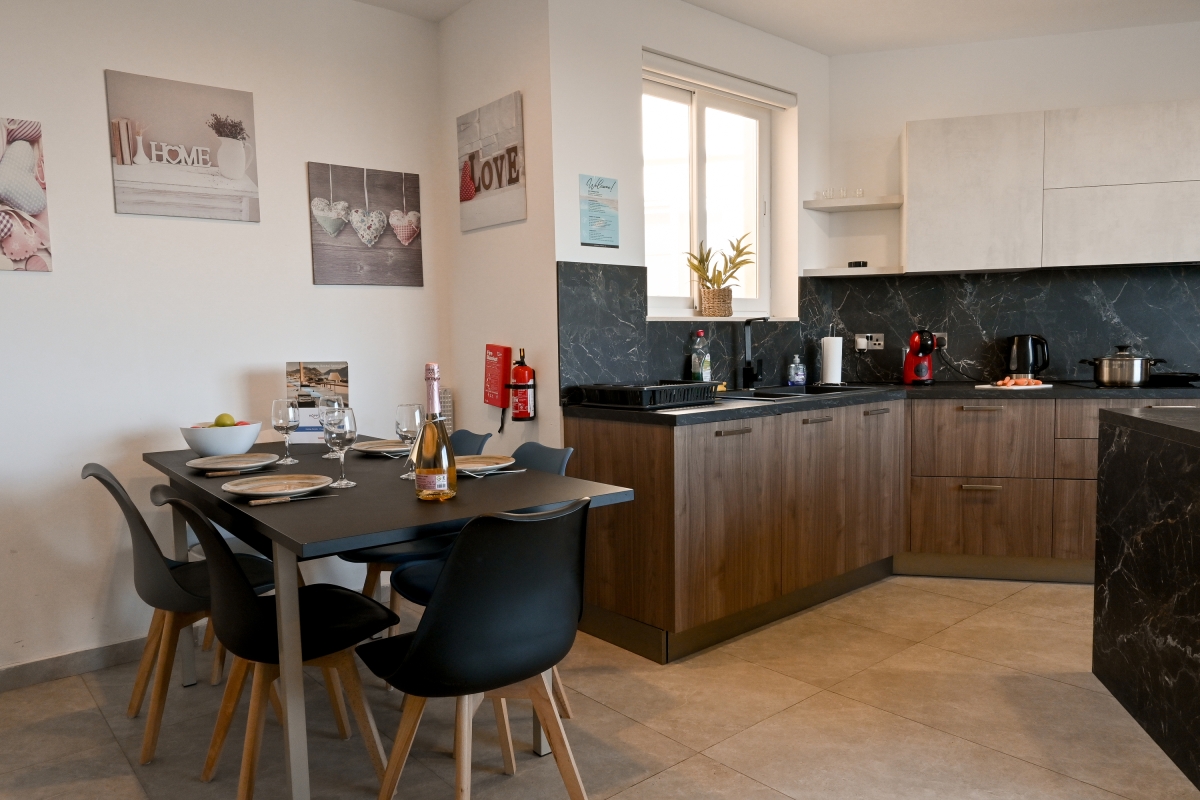 Guests have access to a shared swimming pool and a well-maintained communal garden, perfect for sunbathing or cooling off on warm Gozo days. The fully equipped kitchen includes an induction hob, oven, microwave, toaster, coffee machine, electric kettle, and a fridge with freezer, making self-catering easy and enjoyable. A lift ensures convenient access for all guests, completing this inviting Gozo getaway.
