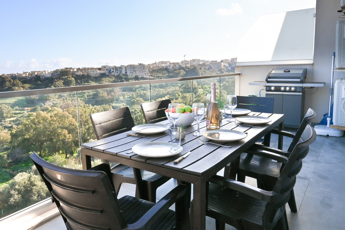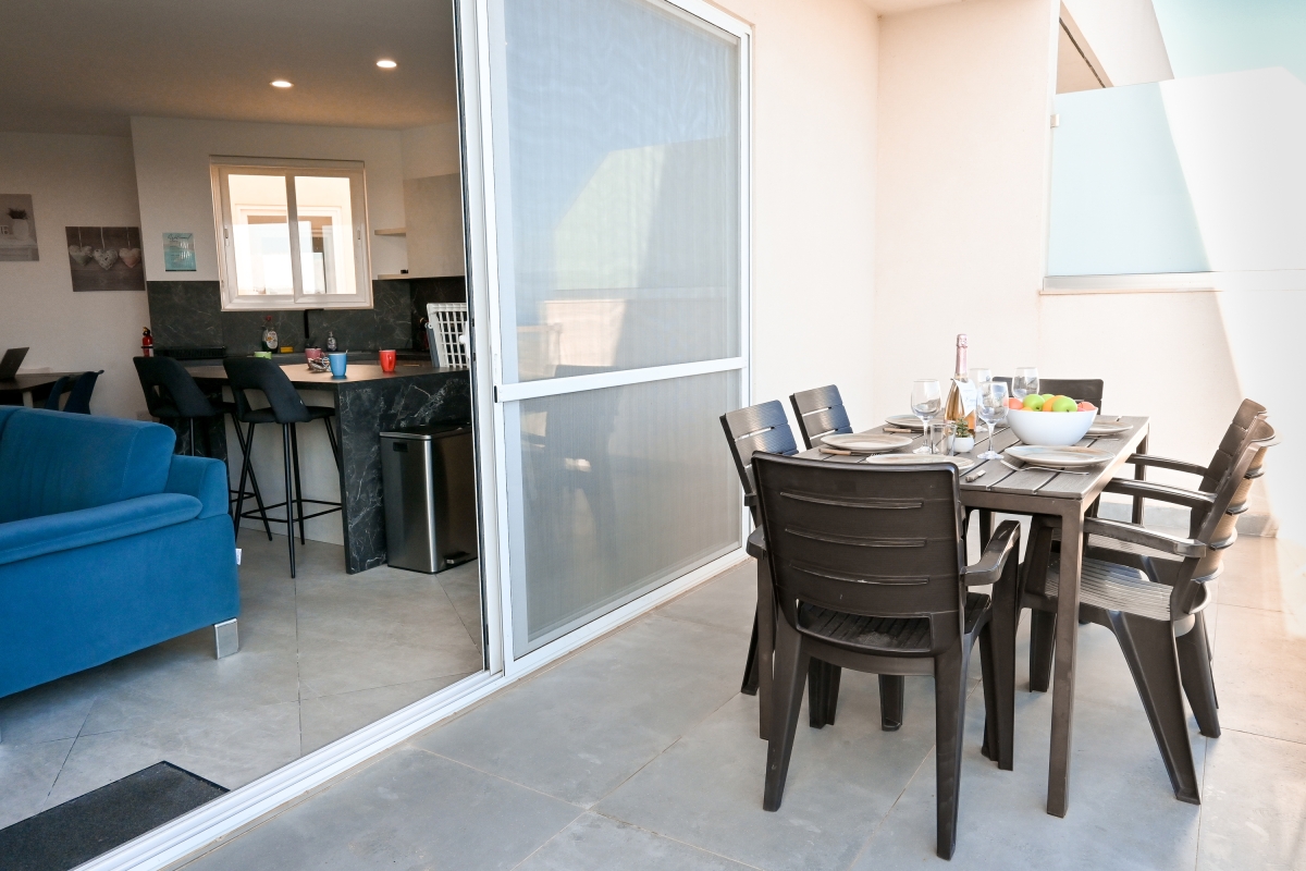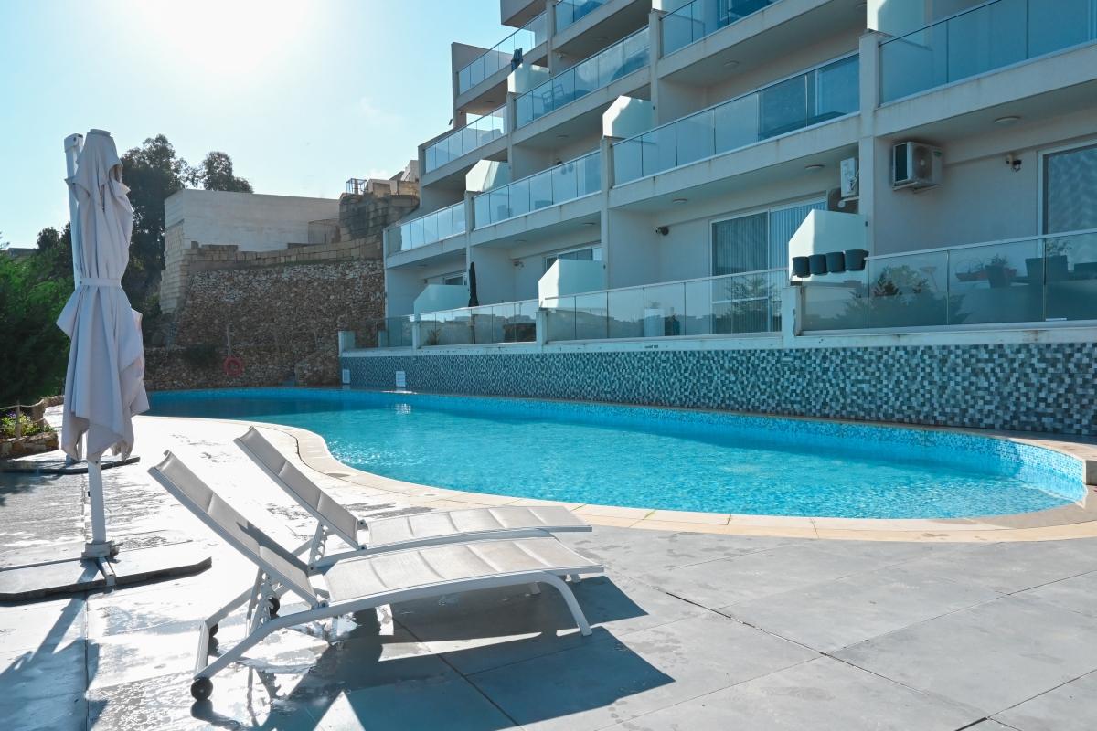 Experience a modern sea-view apartment with a balcony, shared pool, garden, outdoor dining, and peaceful Gozo surroundings.