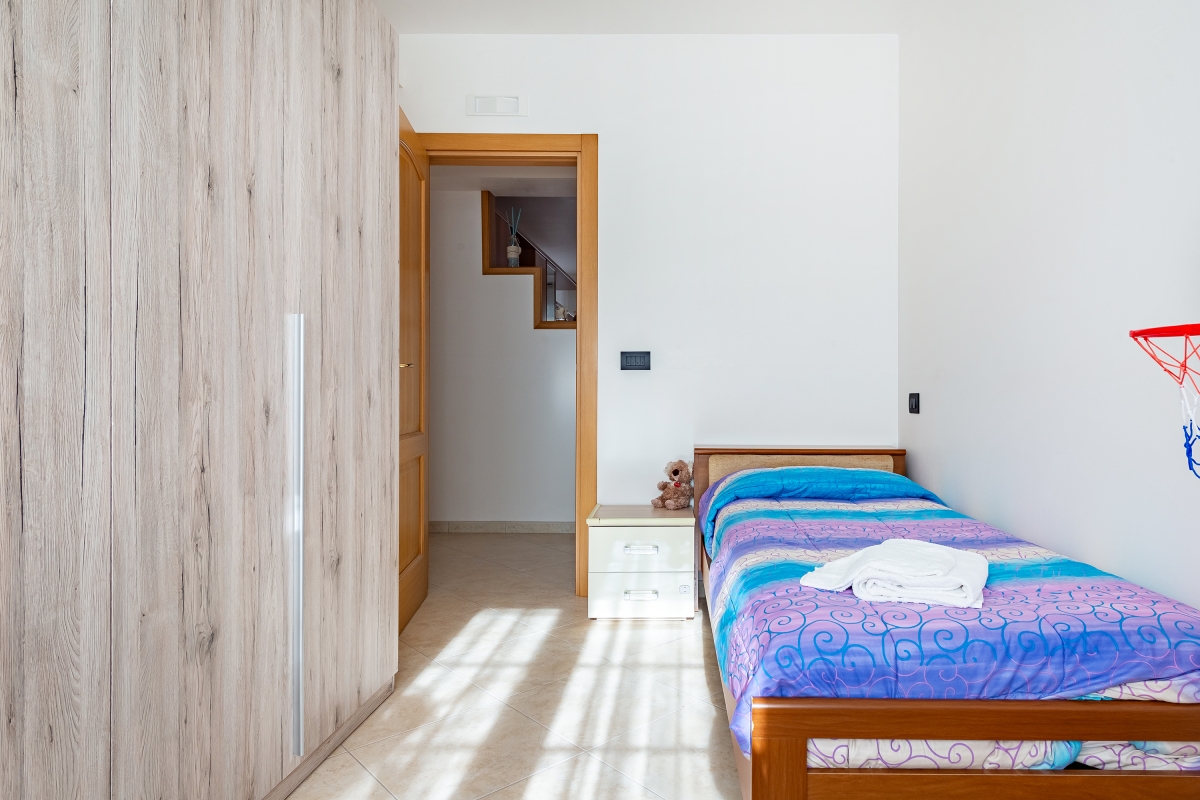 Bedroom 3: The 3rd bedroom is furnished with a single bed and a wardrobe, ideal for an additional guest or child.