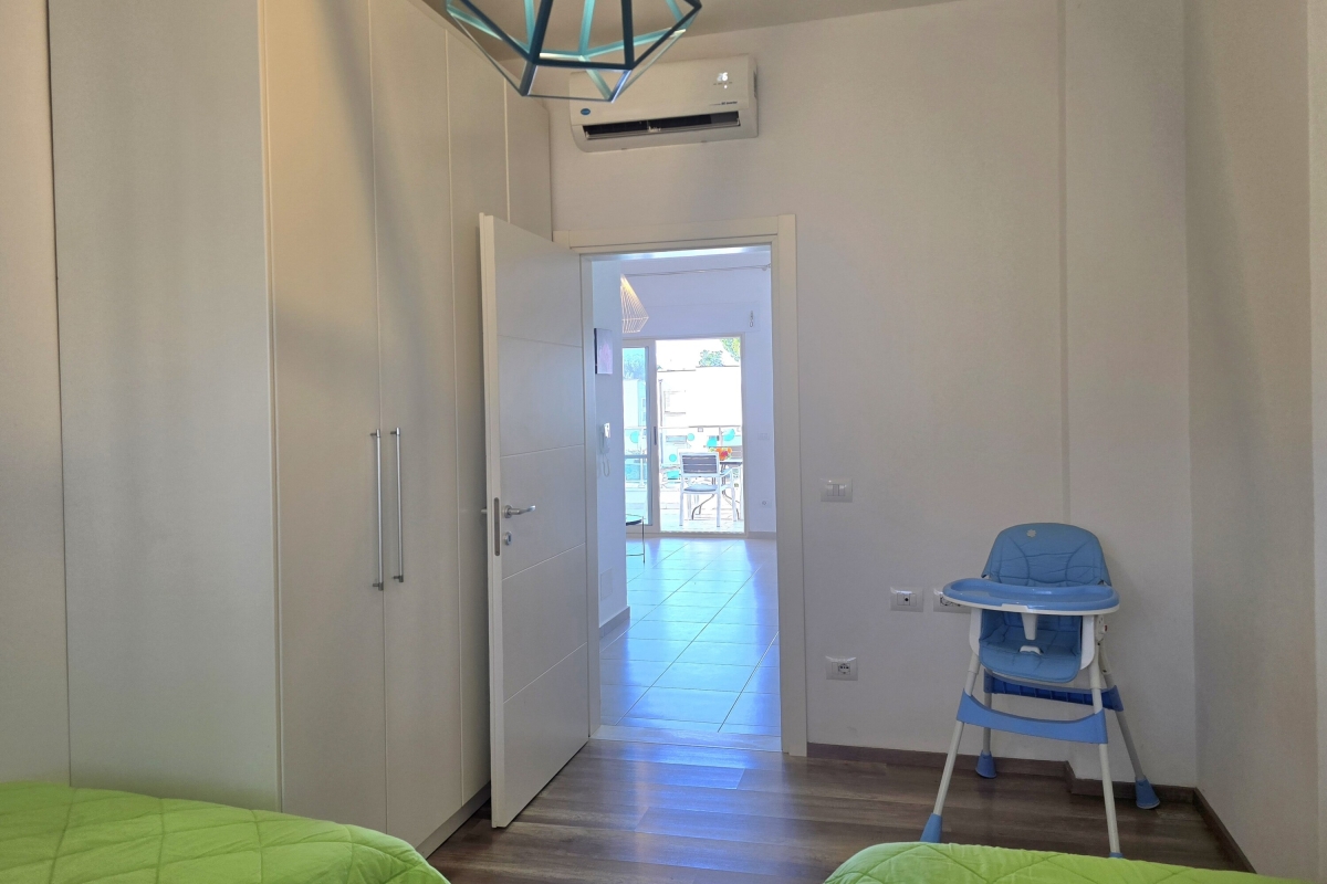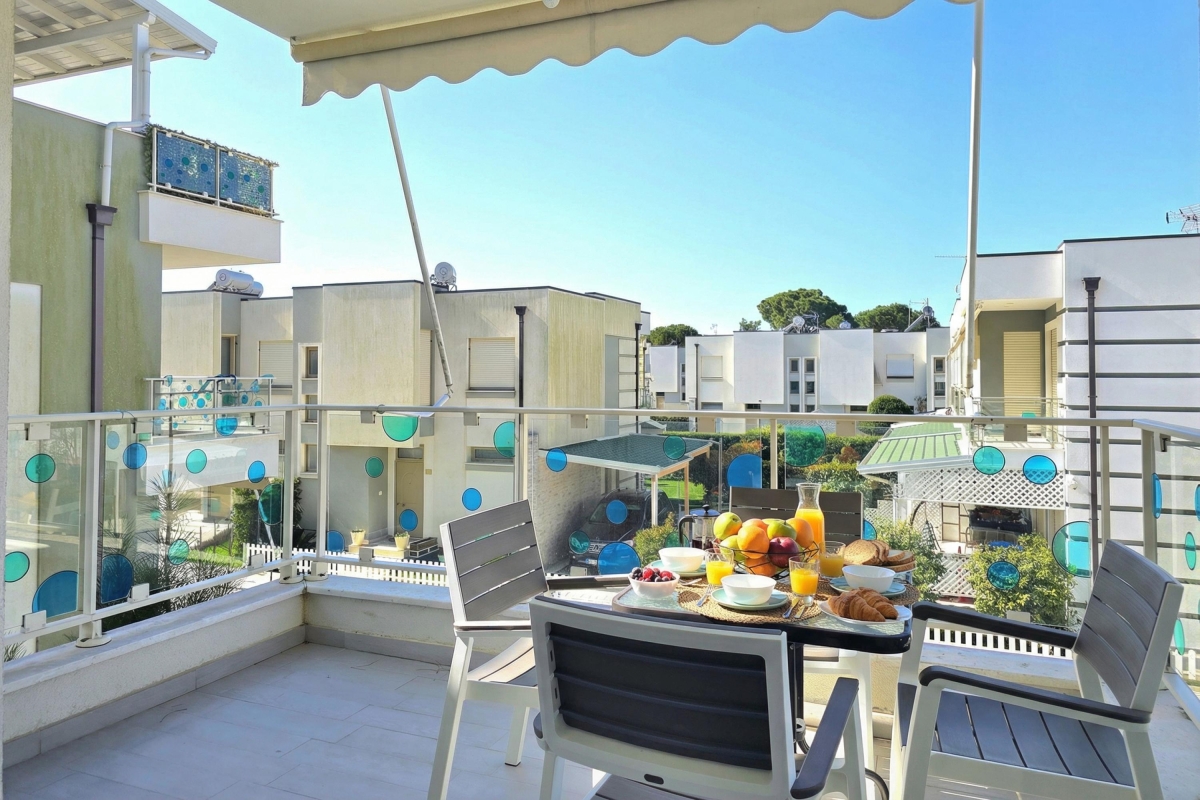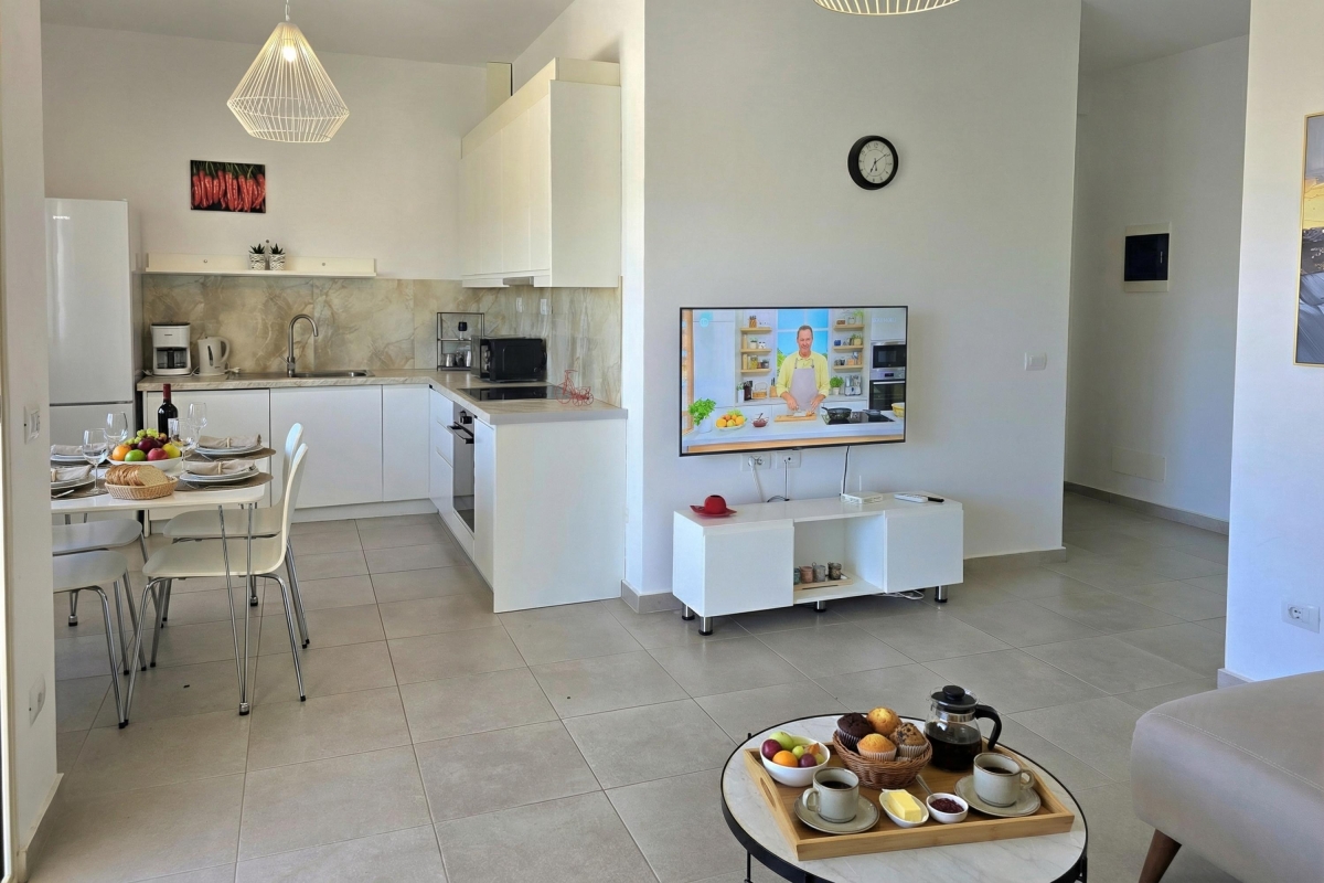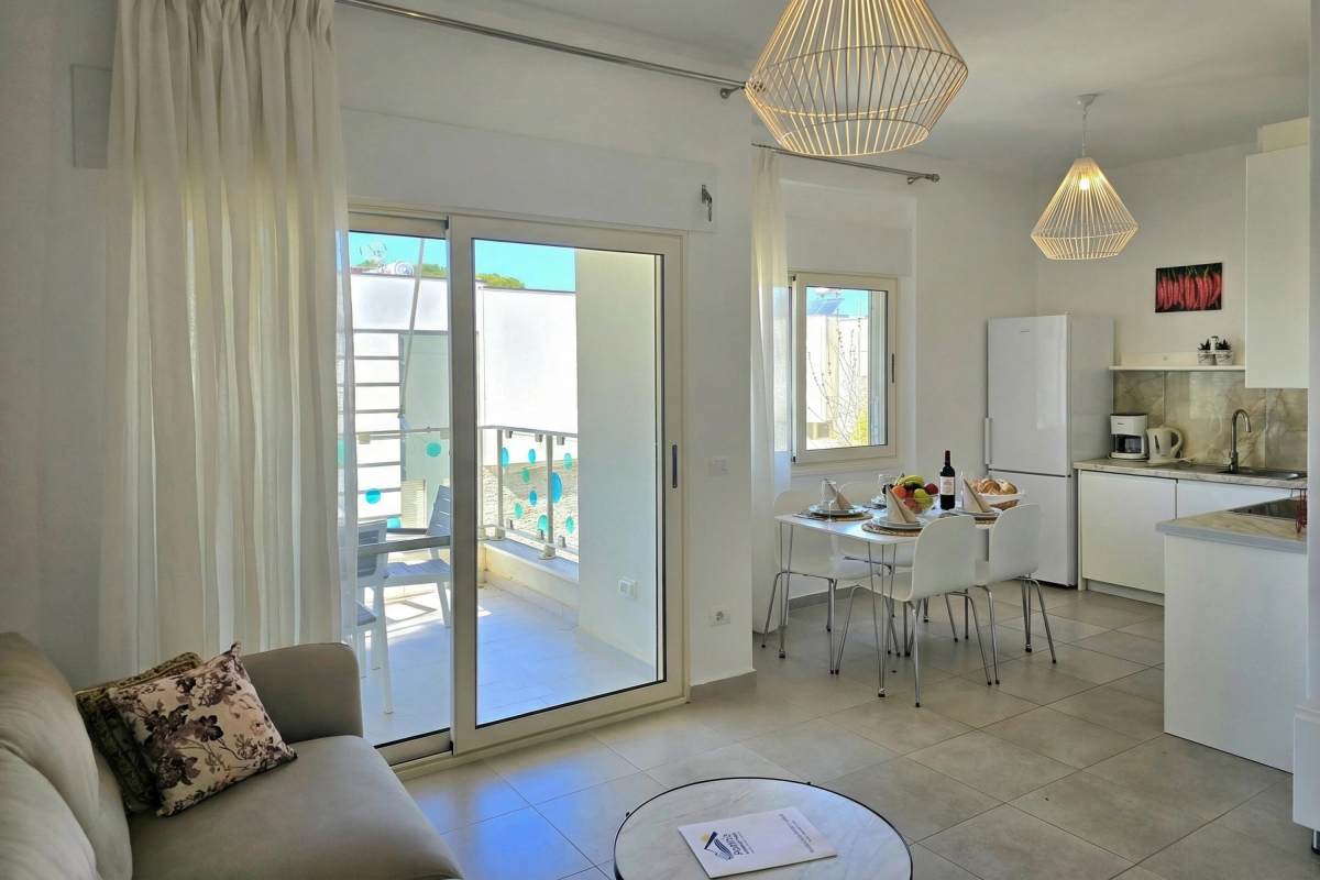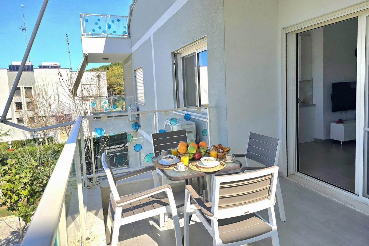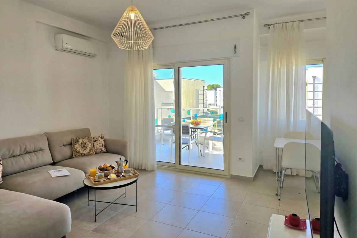 The apartment features a private balcony with a soothing view, furnished with an outdoor table and chairs—perfect for enjoying morning coffee, leisurely meals, or calm evenings immersed in nature. Guests also have access to a shared swimming pool, part of the Perla Resort, providing a refreshing space to unwind and socialize in a beautifully maintained setting.