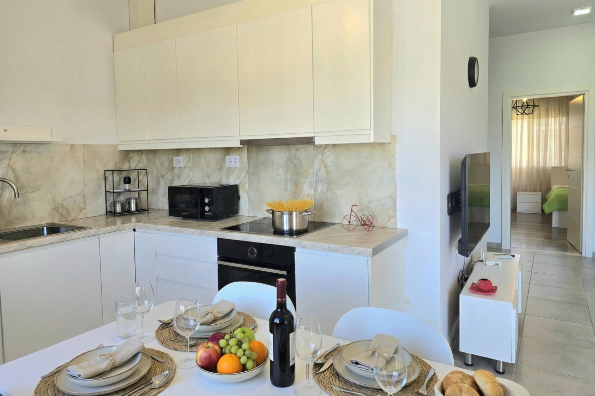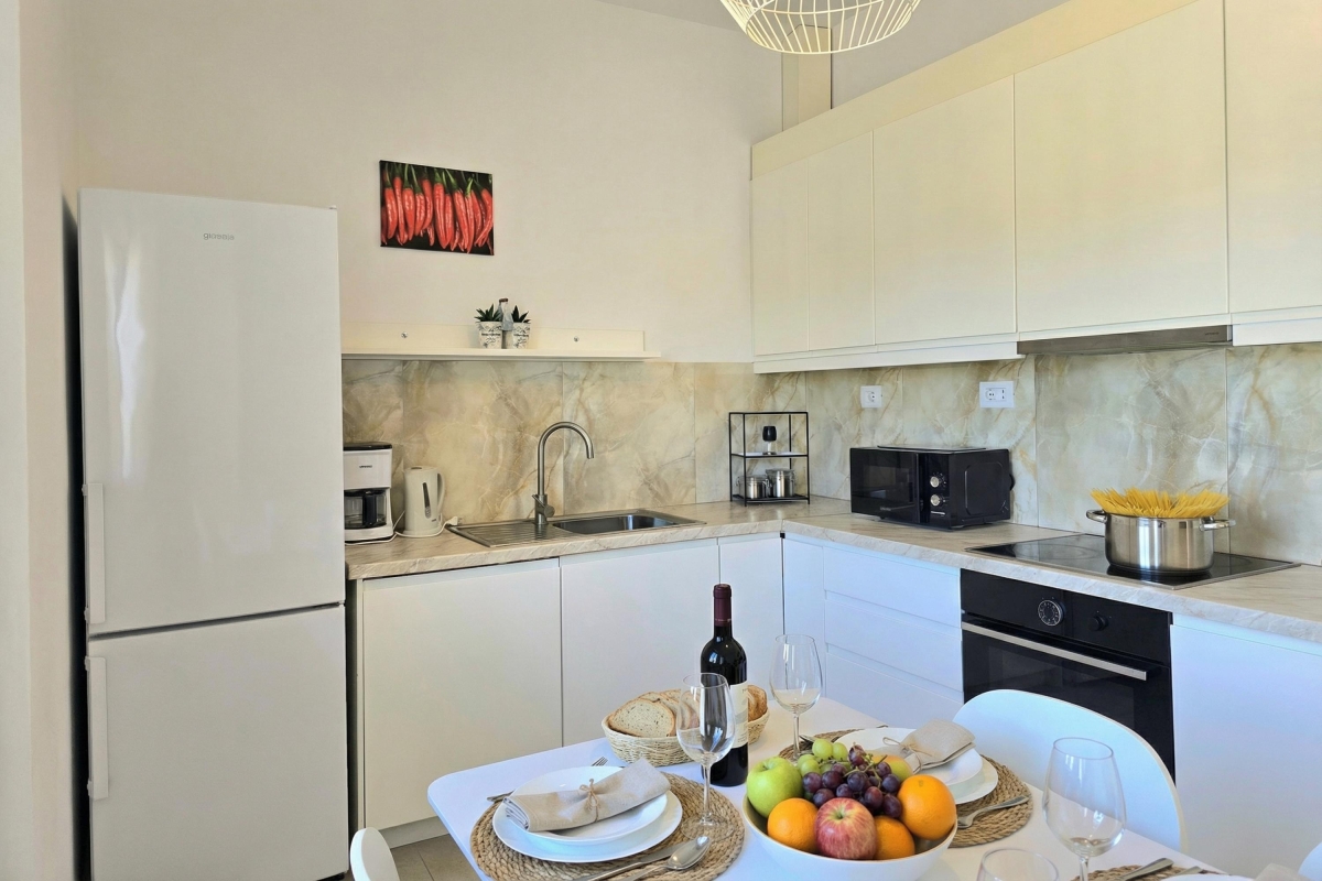 Inside, the apartment is bright and functional, offering a comfortable living environment for short or extended stays. The fully equipped kitchen includes a cooker hob, oven, microwave, dishwasher, electric kettle, and a fridge with freezer, making home-style cooking easy and convenient.
