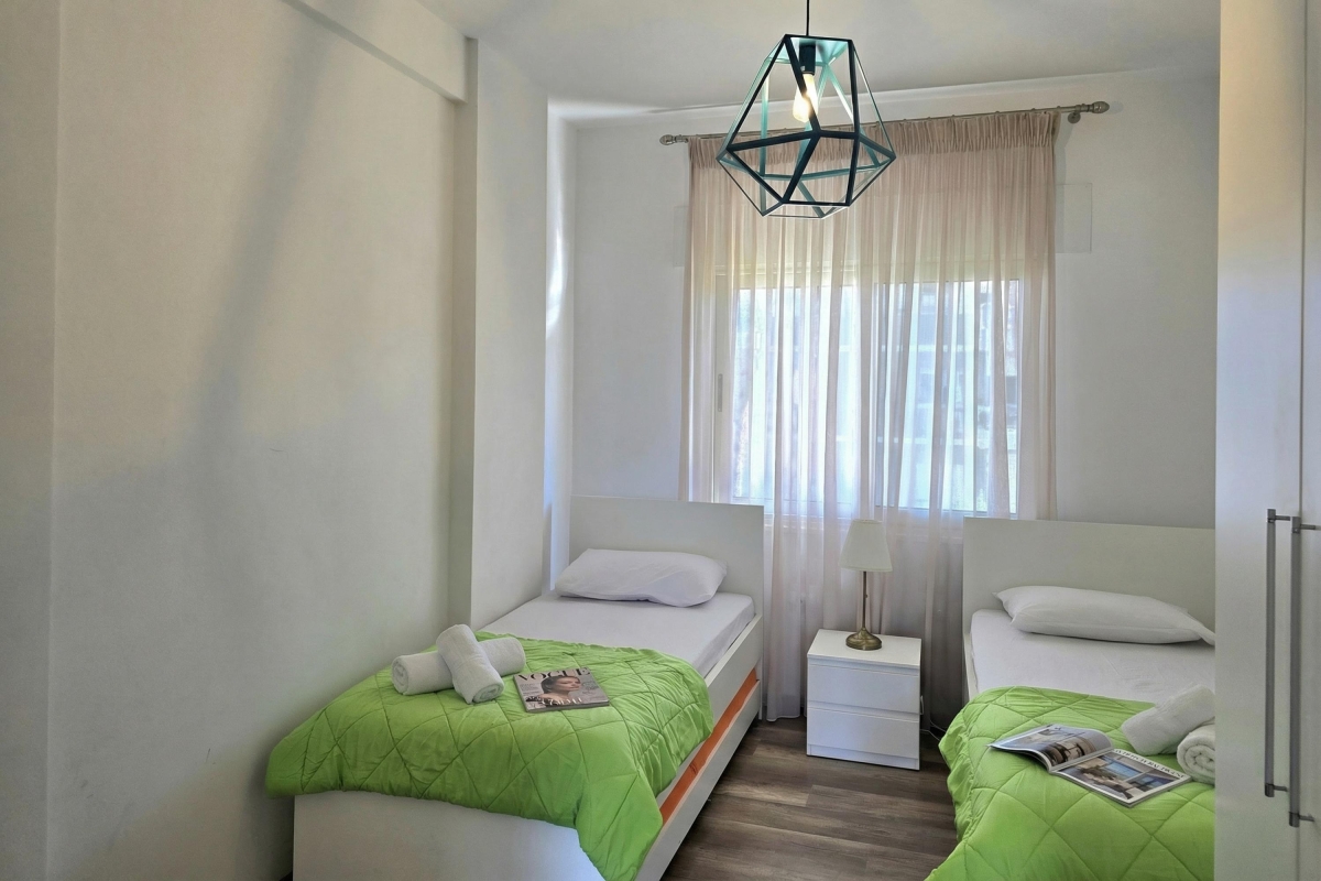 Bedroom 2: This bedroom features a single bed, a single bed with a pullout bed and a wardrobe.