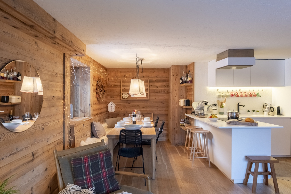The main living space offers a tranquil space for relaxing after a day on the slopes and features a large L-shaped sofa, a Smart flatscreen TV, a built-in dining space and an open-plan kitchen. The kitchen is fitted with a Nespresso coffee machine, an induction hob, an oven, a microwave, a dishwasher and a fridge freezer. The property also offers space for ski-storage.