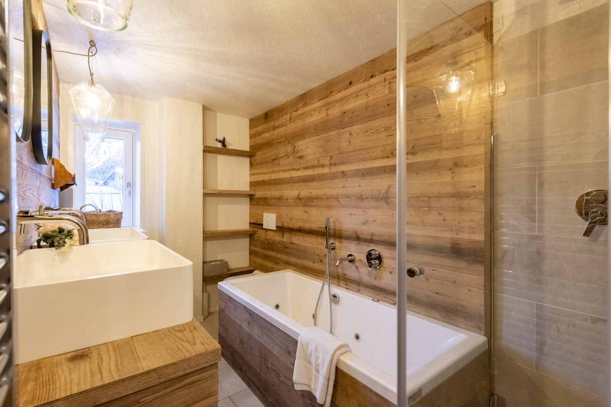 Bathroom: The modern wood-panelled bathroom is fitted with a bidet, a shower, a shower in the bath, a washbasin, and a WC.
