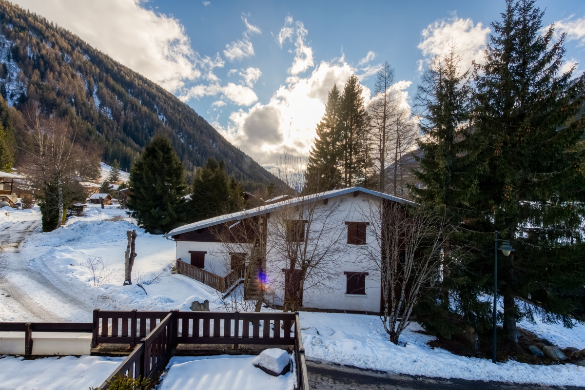 Budget-friendly ski-in ski-out retreat in Argentière, Chamonix, with balcony mountain views, quiet green setting and close to lifts.