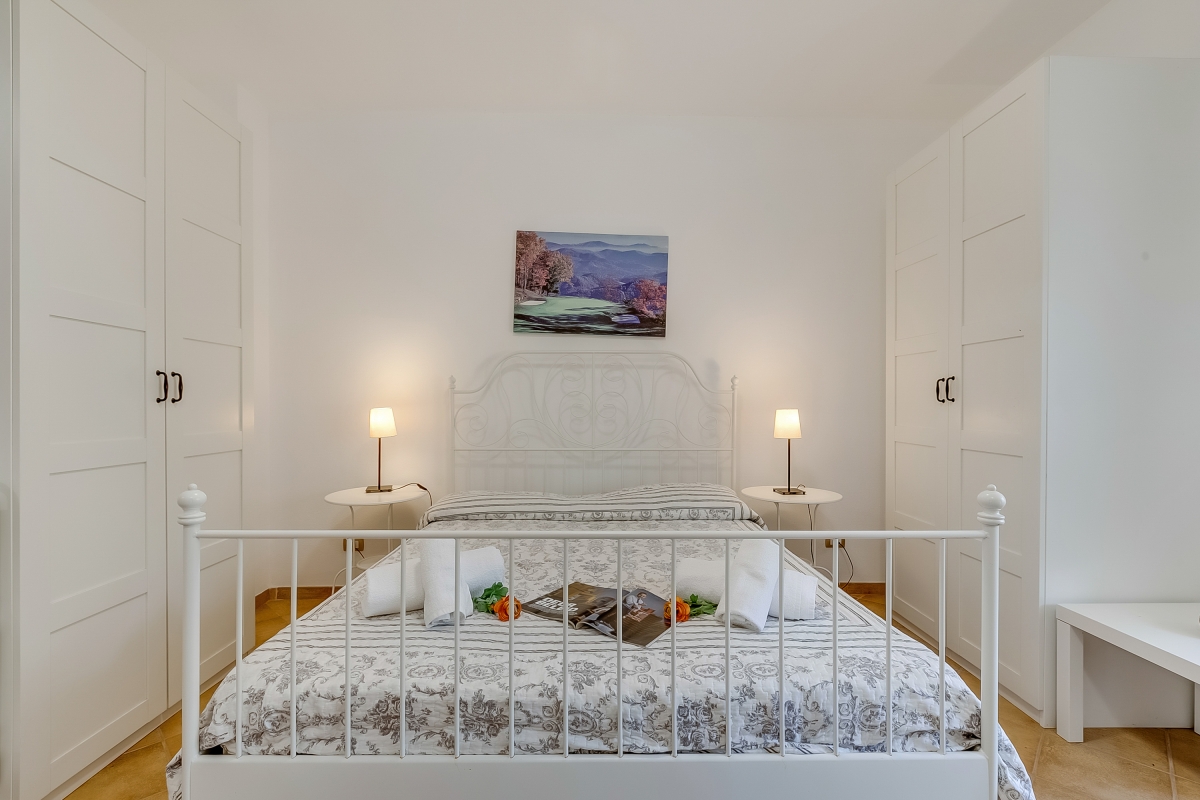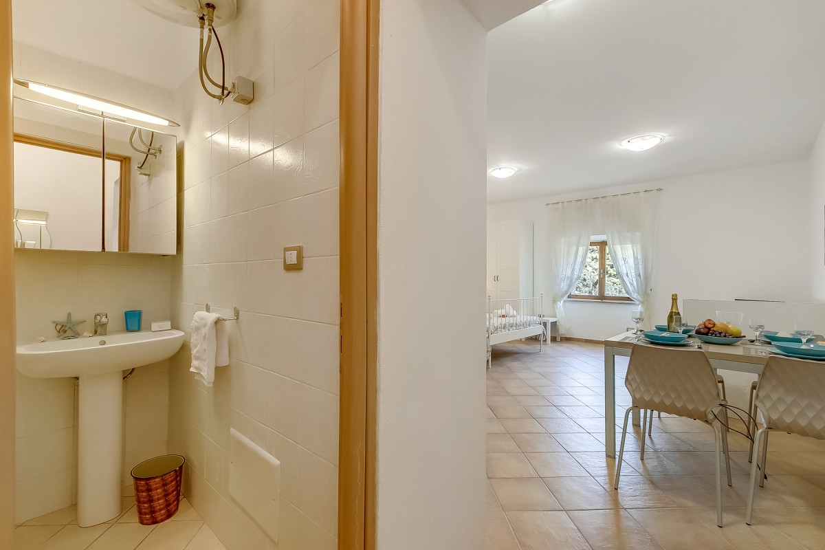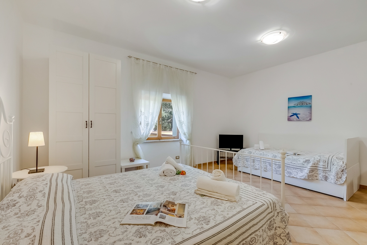 Inside, the main living space incorporates a small kitchen and is furnished with a double bed, a single with a pull-out and a flat-screen TV. The kitchen is equipped with a Moka coffee machine, a cooker hob, a microwave and a fridge.