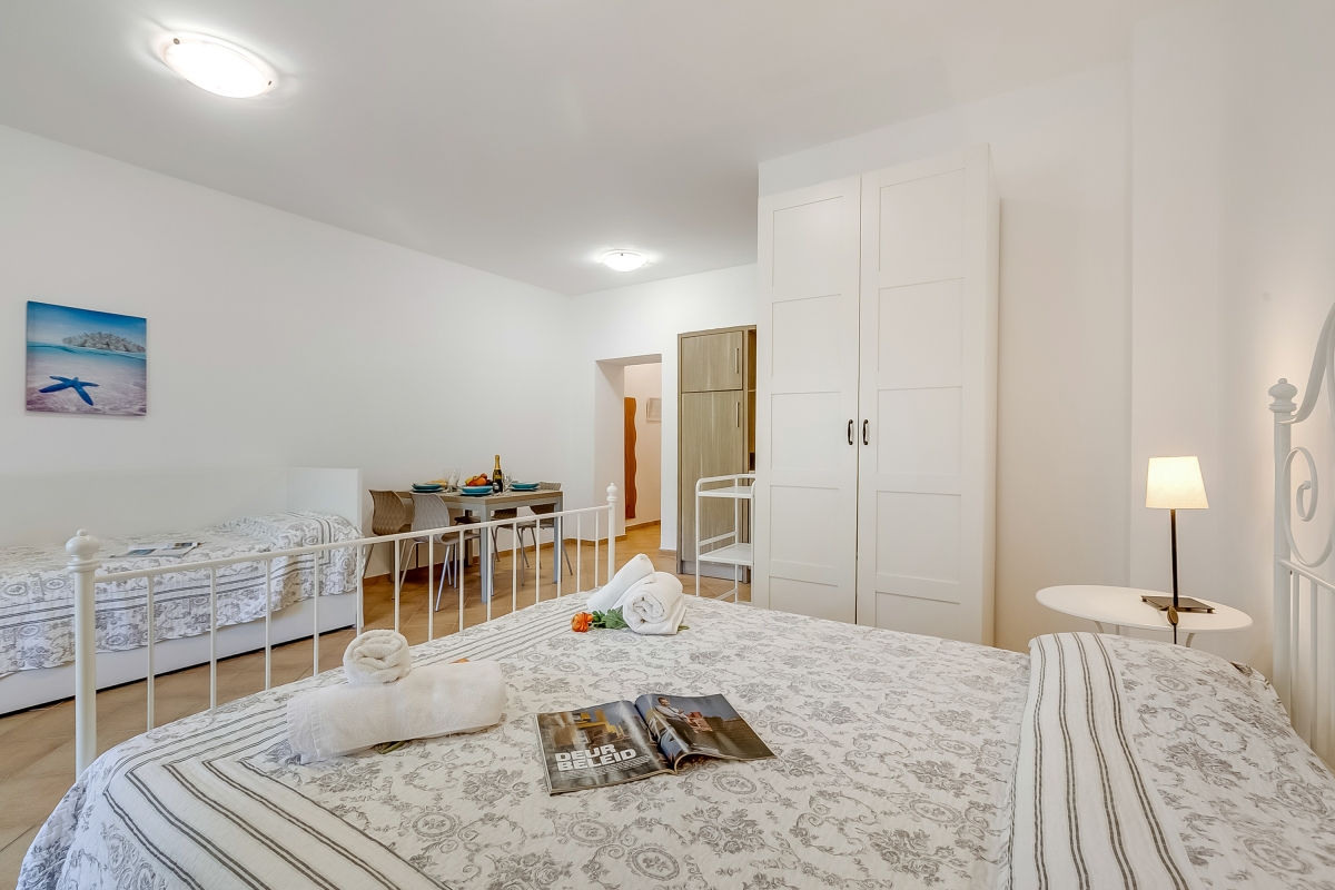 This room features a double bed, a single pullout bed with a single bed and a wardrobe.