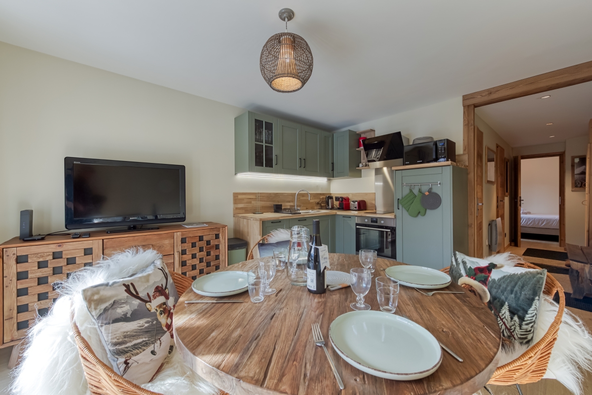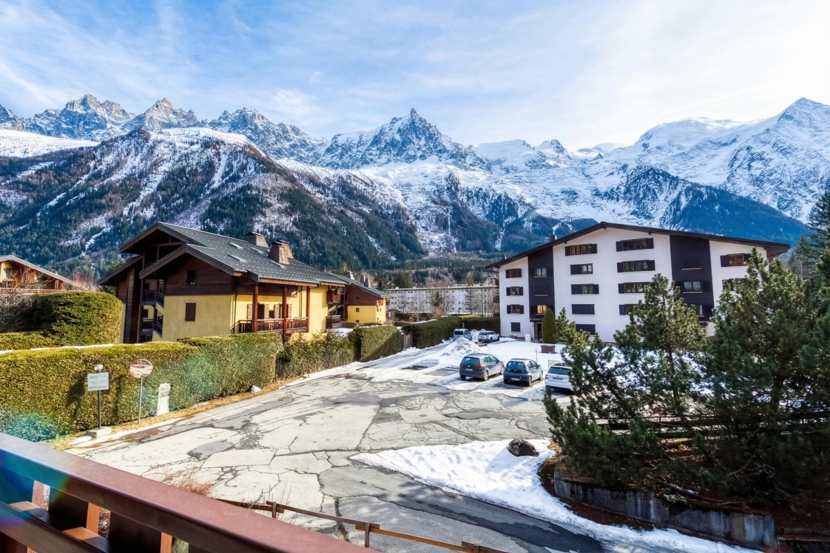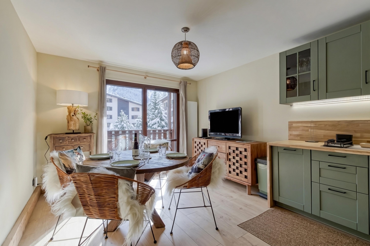 Bright and thoughtfully arranged, the living space opens onto a balcony offering beautiful views of Mont Blanc and the surrounding peaks, creating an inviting spot for morning coffee or relaxed evenings in the fresh alpine air. Set amid greenery in a wonderfully quiet area, the apartment provides a calm atmosphere while remaining well-connected for outdoor adventures.