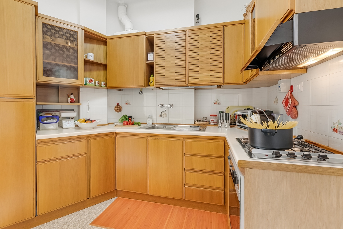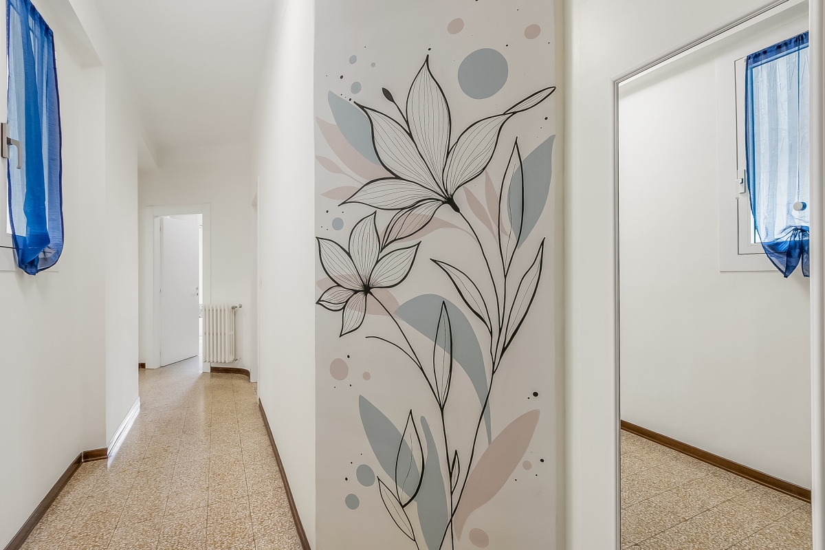 The apartment is located on the fourth floor with elevator access and opens onto a long, well-kept corridor. On the left, you’ll find a modern bathroom, followed by the master bedroom with access to a private balcony. On the right side, there is a large and cozy living room with a balcony connected to the kitchen, which can also be reached by continuing to the end of the corridor.