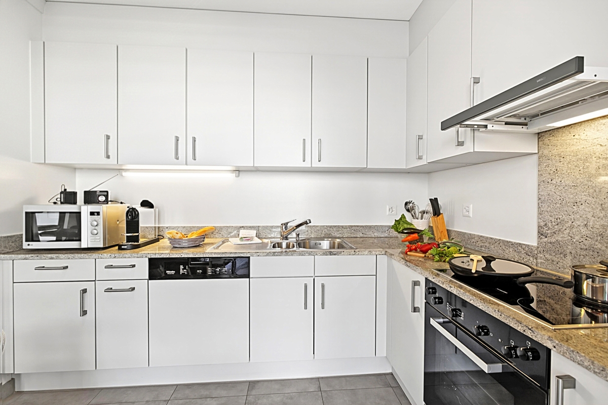 The open-plan kitchen is fully equipped for 4 guests and provides everything needed for convenient self-catering. It includes a cooker hob, coffee machine, electric kettle, microwave, oven, dishwasher, and a fridge with freezer, allowing guests to prepare meals comfortably during their stay.