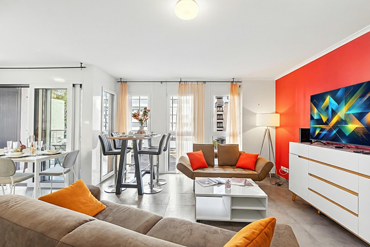 Inside, the apartment offers a bright and spacious layout designed for relaxation. A welcoming hallway connects the two bedrooms to the living area and the main bathroom, creating a practical and well-organized space. The living room is particularly airy and inviting, decorated in bright and tasteful colours that enhance the sense of warmth and light throughout the home. Guests can unwind here while enjoying the Smart TV and Wi-Fi, perfect for relaxing evenings after a day of sightseeing.