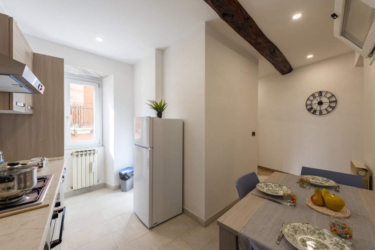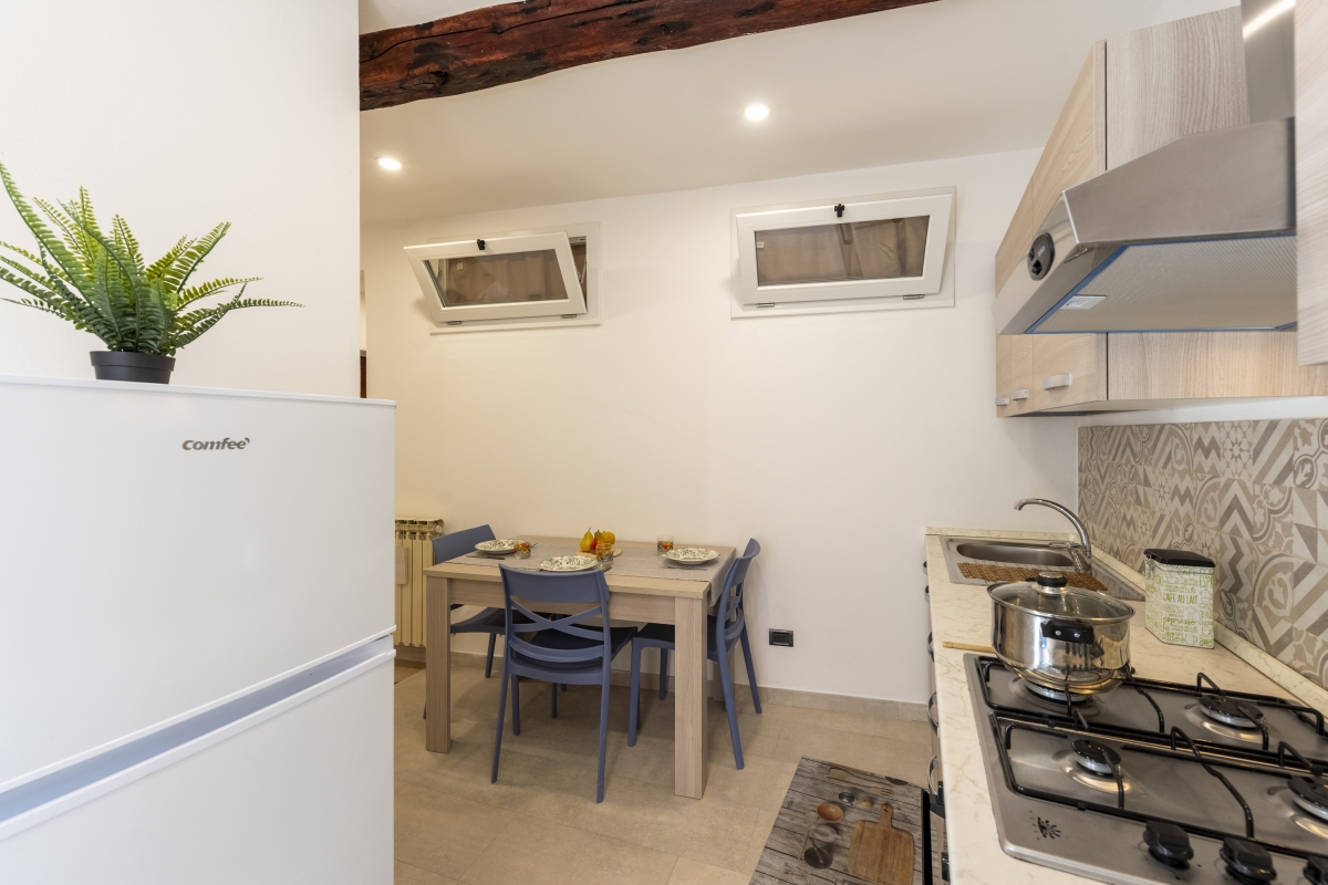 The property features a stylish interior with thoughtfully chosen vintage furniture and a modern kitchen. The living room is furnished with a dining table and chairs, a comfortable sofa and a Smart flatscreen TV. The separate eat-in kitchen is equipped with: a breakfast table, a Moka coffee machine, a cooker hob, an oven and a fridge freezer.