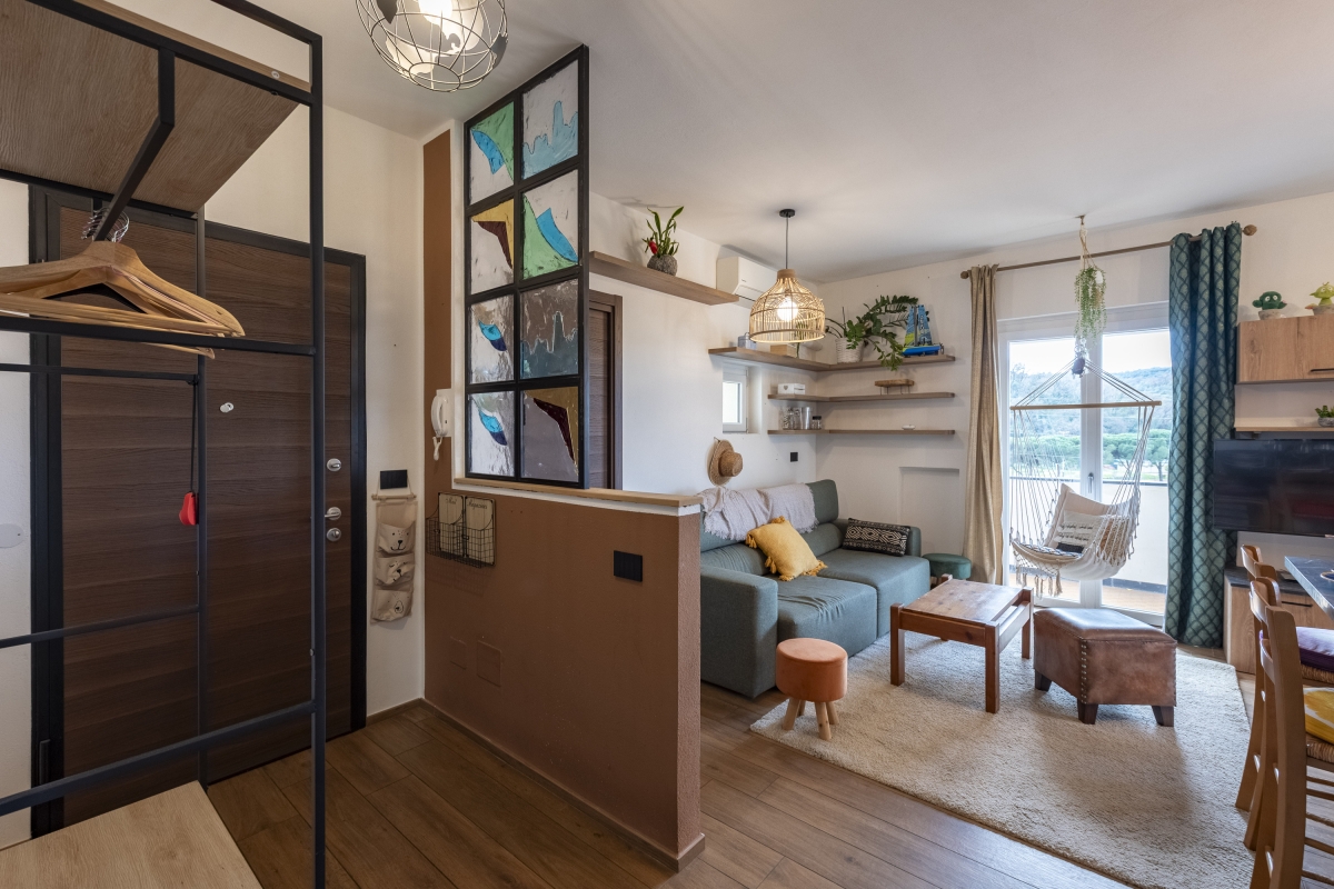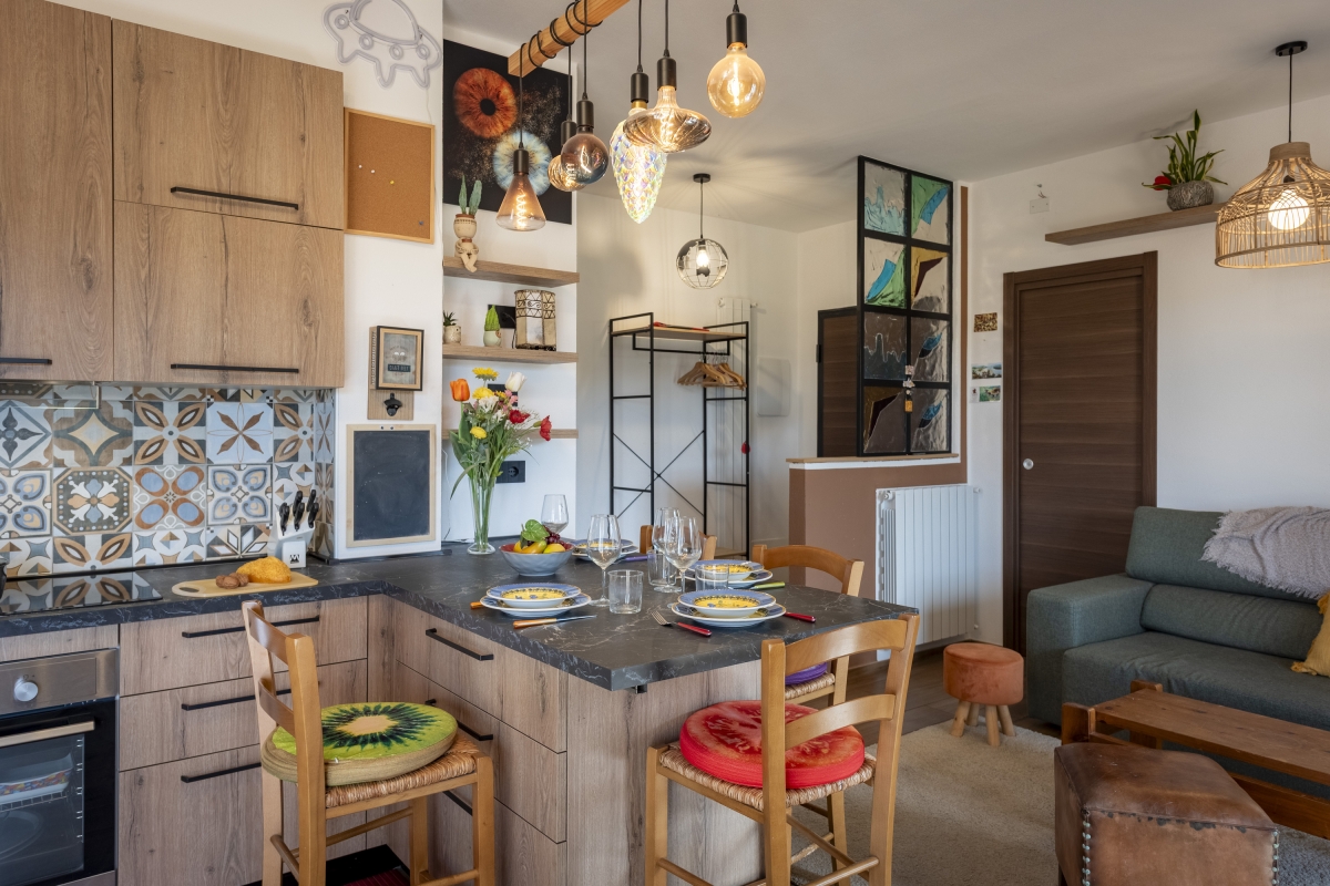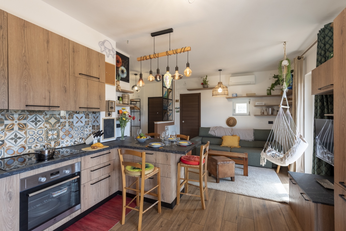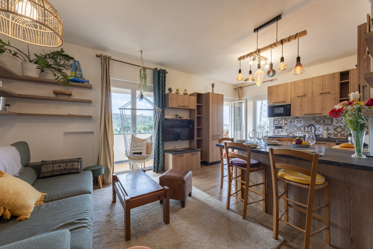 The apartment features a light-filled open-plan living room that opens out to the balcony. This space is furnished with a comfortable sofa, a flatscreen TV and incorporates a modern kitchen that's equipped with a Moka coffee machine, an induction hob, an oven, a dishwasher, a microwave, and a fridge freezer.