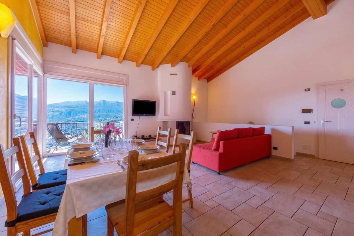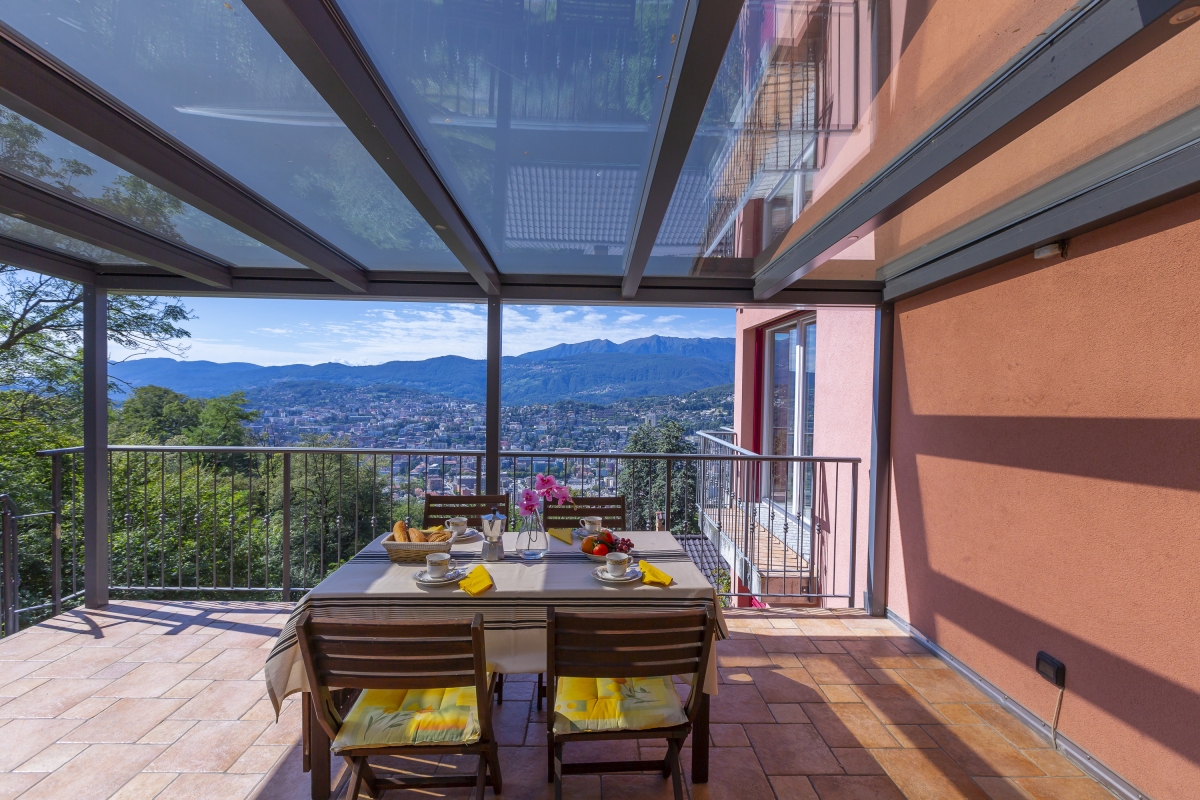 A sunny partially-covered balcony terrace invites you to relax with a meal and entertain in style. Grown-up guests can dine at the stylish dining table, whilst younger guests dine at their own child-friendly dining table. This alfresco dining area and the stylish sun lounger are complemented by far reaching mountain views which stretch across Lugano and the Ticino region.