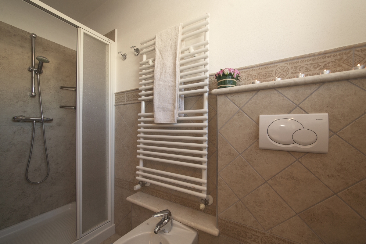 The spacious apartment features a modern bathroom fitted with a power shower, washbasin, hairdryer, heated towel rack, WC and bidet.