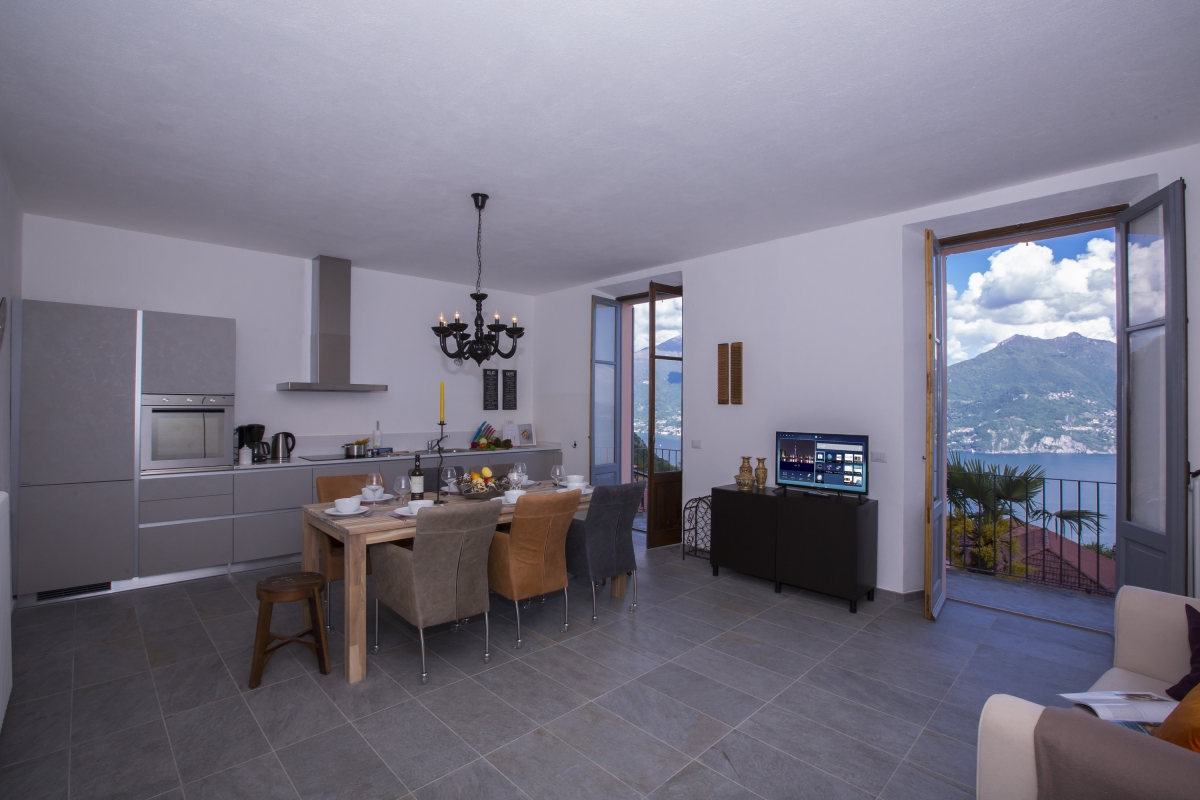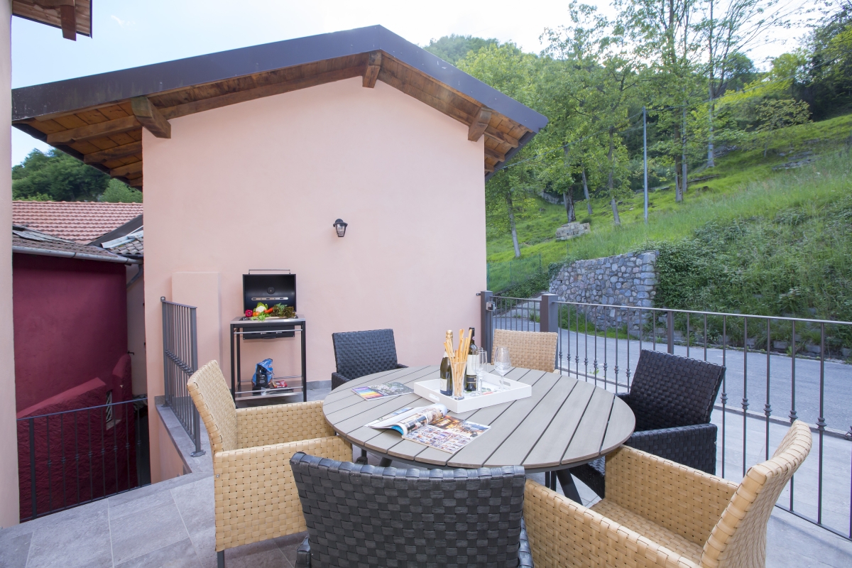 The 2 outdoor areas offer carefree space for relaxing and entertaining outdoors. The front balcony offers a magnificent view of the Alps and Lake Como. The rear patio has a BBQ and outdoor dining area.