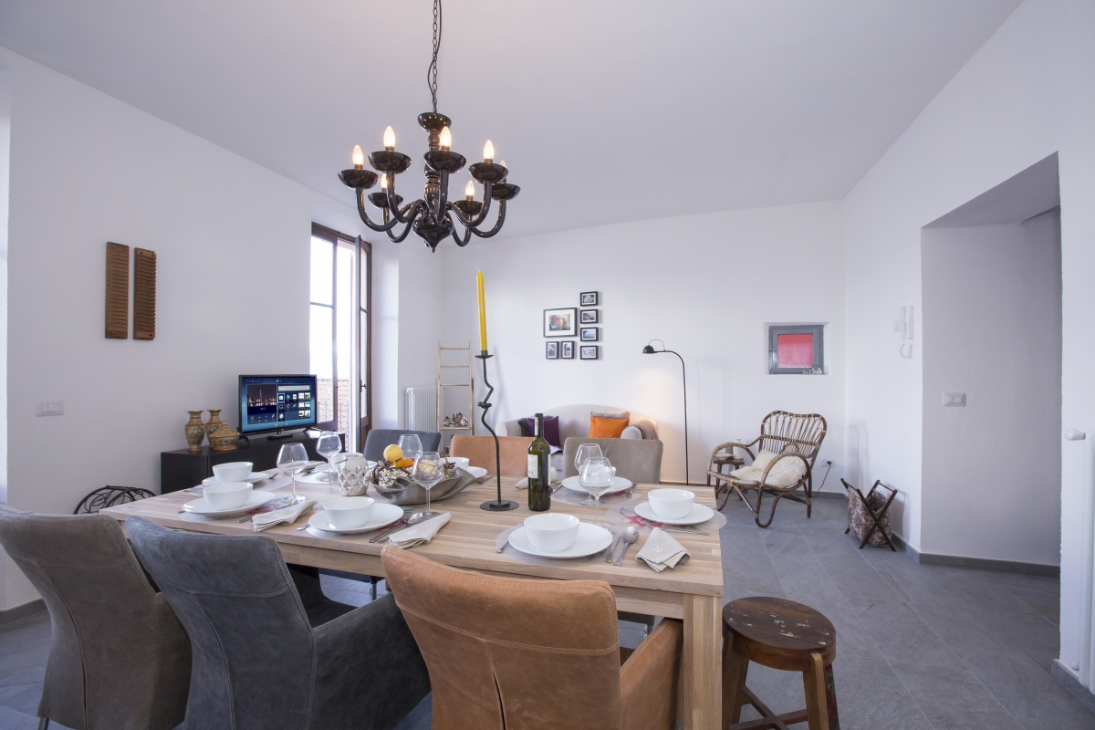 A large dining area for 8 persons completes the chic, modern fitted kitchen which is equipped with an induction hob, eye-level oven, electric kettle, coffee maker, Nespresso machine, dishwasher and fridge-freezer.