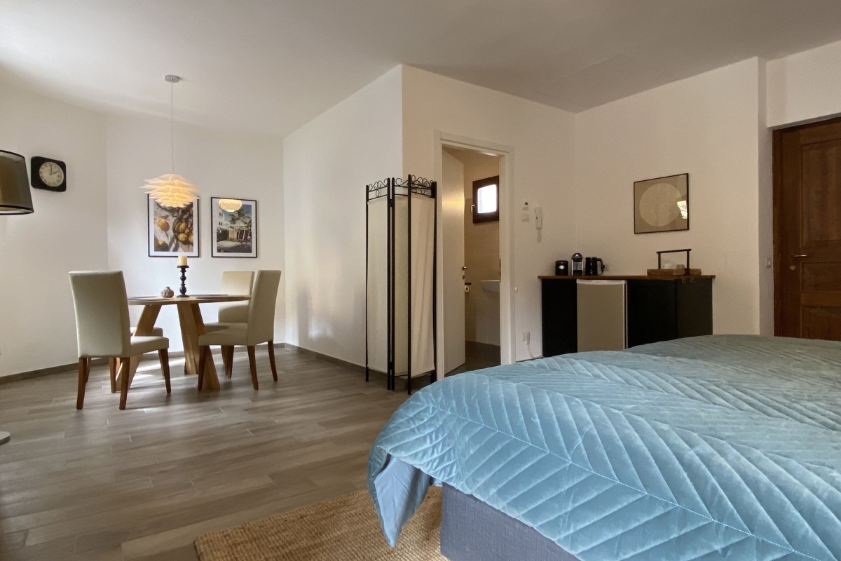 The fourth bedroom with a double bed and a spacious bathroom with a modern shower, sink and toilet is located in the separate spacious apartment of this complex. Independent of the main building, you can prepare a coffee in the morning with a Nespresso machine and plan the day in the chic dining area.
