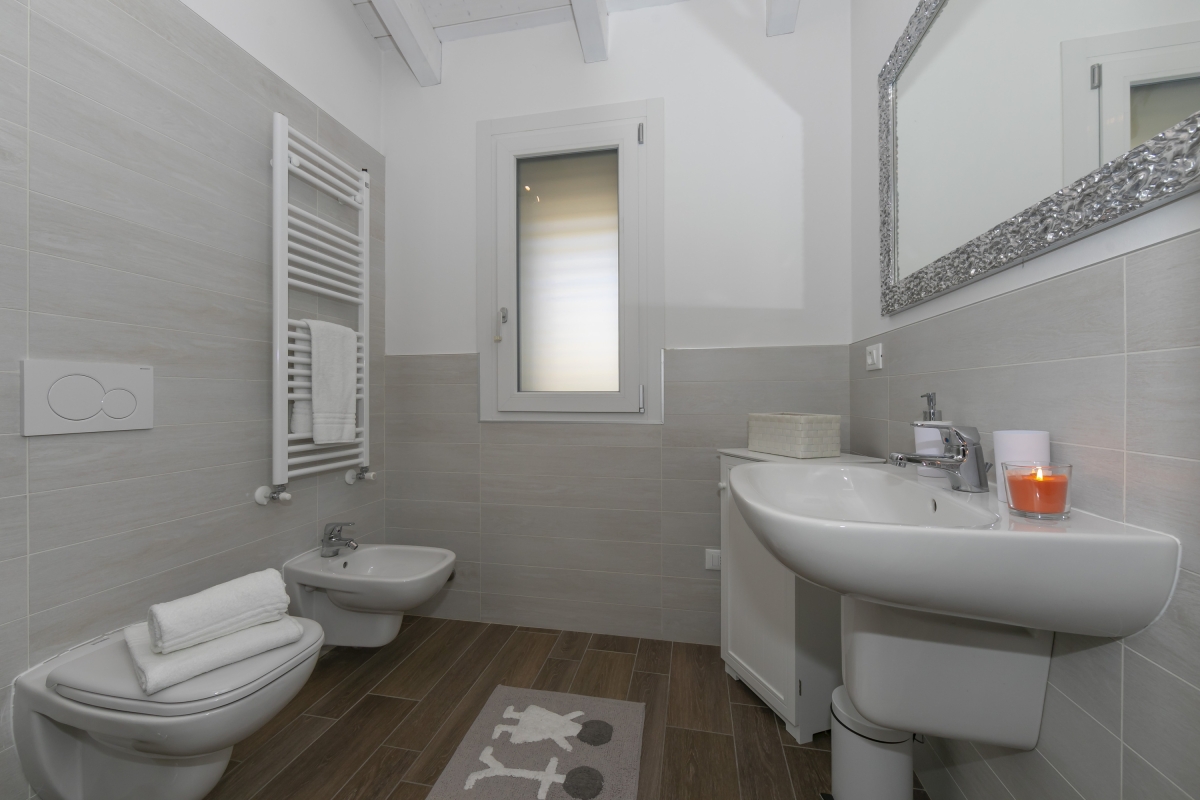 • A modern suite fitted with a shower cubicle, wash basin, heated towel rack, WC and bidet