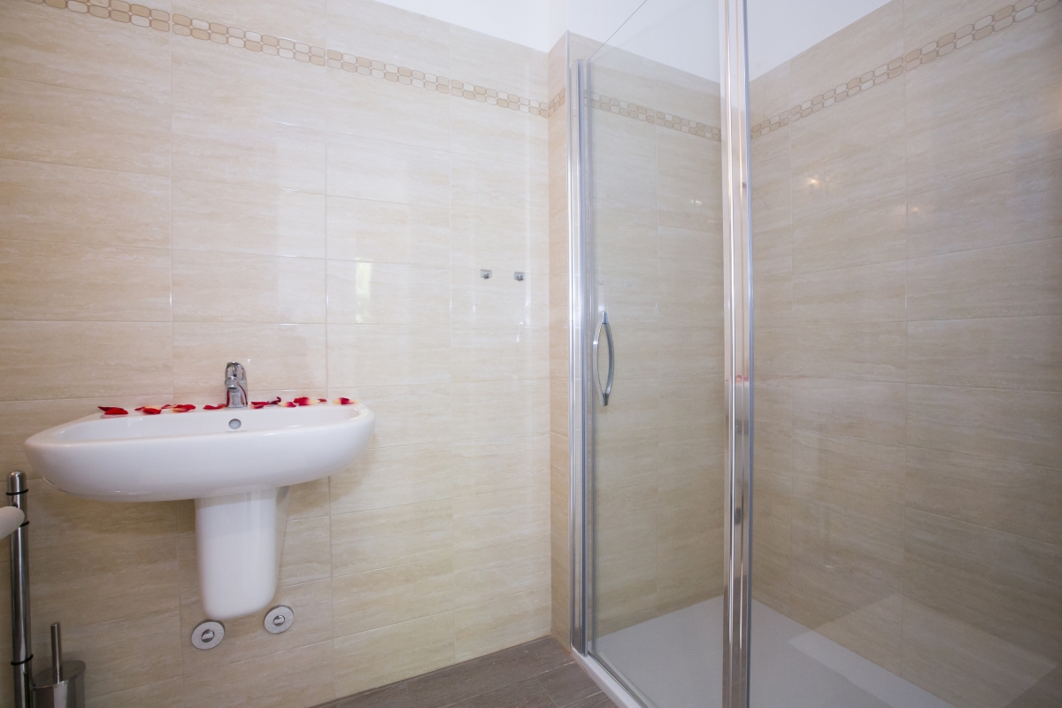 The family bathroom is fitted with a double walk-in shower, a wash basin, heated towel rack, universal shaver plug, a WC and bidet.