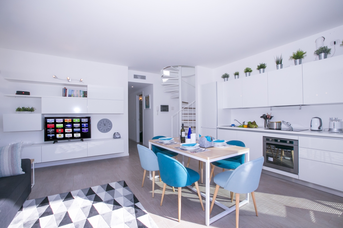 A sleek integrated kitchen to the living space is equipped with an induction hob, oven, microwave, coffee machine, electric kettle, a toaster, dishwasher and fridge. Complemented by a chic dining area with 6 stylish chairs, the scene is set for memorable dinner parties!