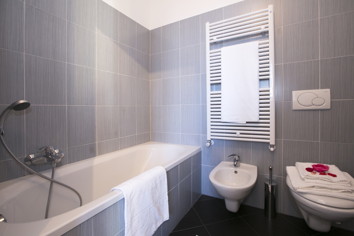 The spacious apartment features a main bathroom suite fitted with a walk-in shower cubicle, wash basin, heated towel rack, WC and bidet, alongside an en-suite fitted with a bath tub, shower tap, wash basin, heated towel rack, WC and bidet.