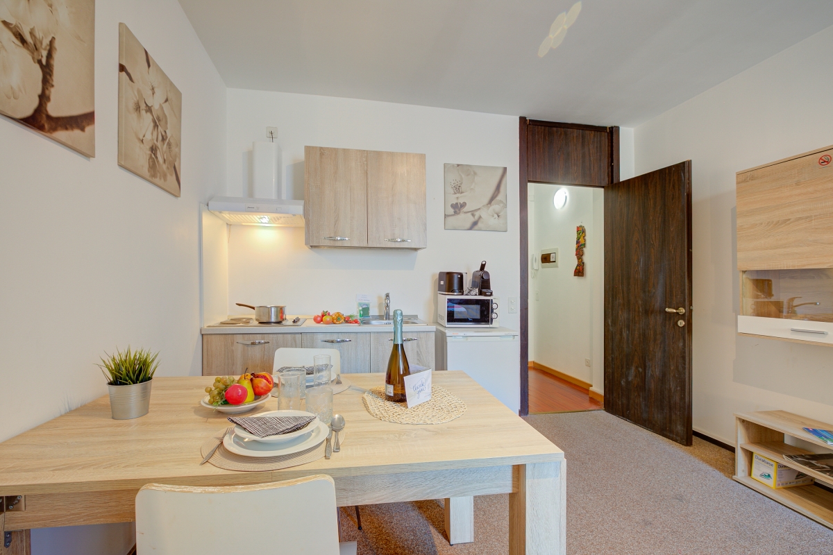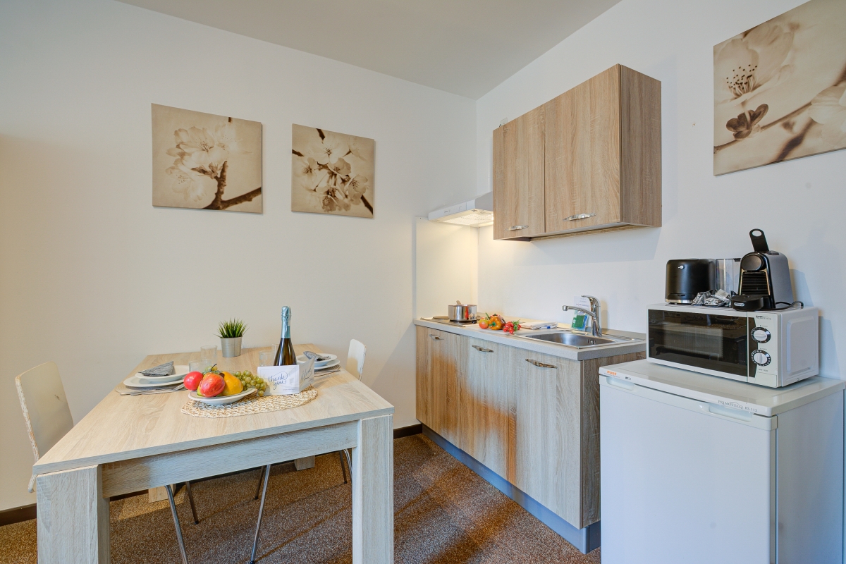 The Kitchenette and dining area for 2 features all the necessary appliances for preparing carefree drinks and simple meals-in; being equipped with a cooker hob, toaster, electric kettle, Mokka coffee machine, microwave and fridge.